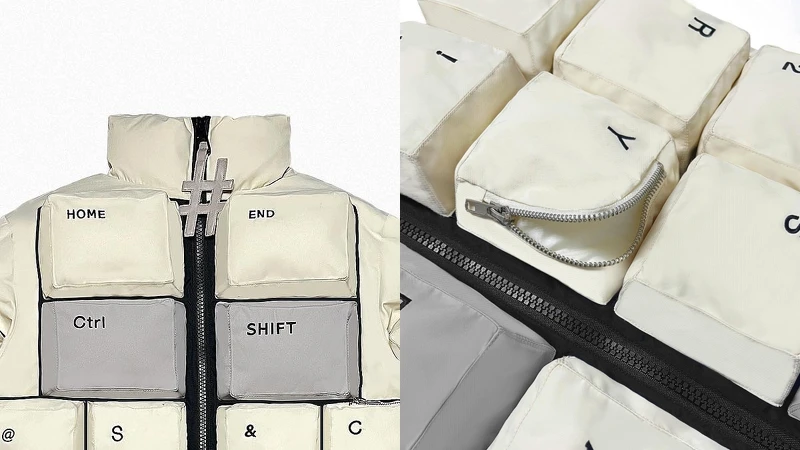 這件外套最有趣的地方,在於它不是平面圖案,而是真的做出一顆顆的立體「按鍵」在外套上,每個方塊都有澎度,還原度非常高,同時在顏色上也做了區分,常用功能鍵像Ctrl、Shift、Return以灰色呈現,其餘字母多為米白色,視覺上有層次,正中央的拉鍊是一個大型「#」符號吊飾,呼應數位世代的語言,更有趣的是,有些按鍵其實暗藏功能,例如Y鍵的位置設計成可開啟的小拉鍊口袋,讓「鍵盤」不只是裝飾,而是真的有收納用途。