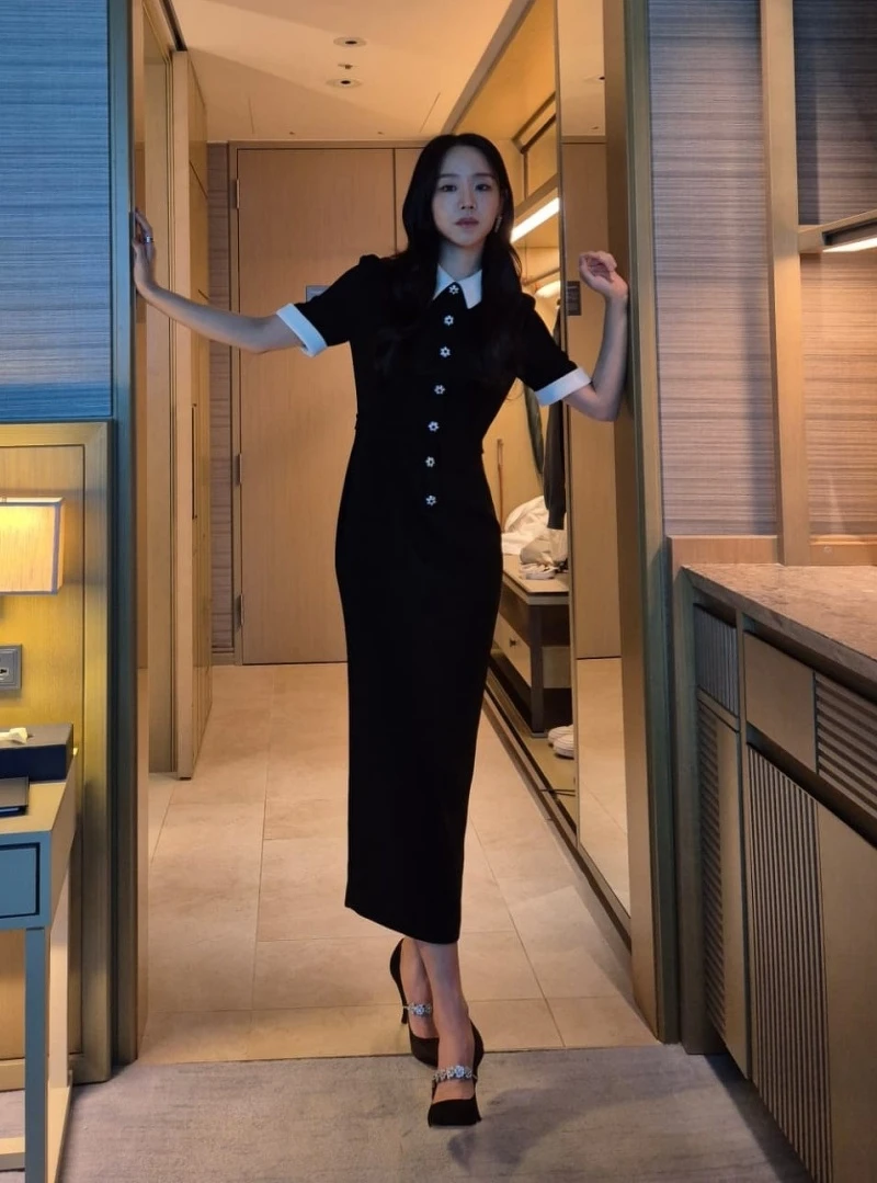 黑色修身長洋裝搭配對比白領細節,是極簡卻有記憶點的選擇,沒有繁複飾品,重點全在版型,這種「一件完成」的單品,俐落、優雅又不需要費心搭配。