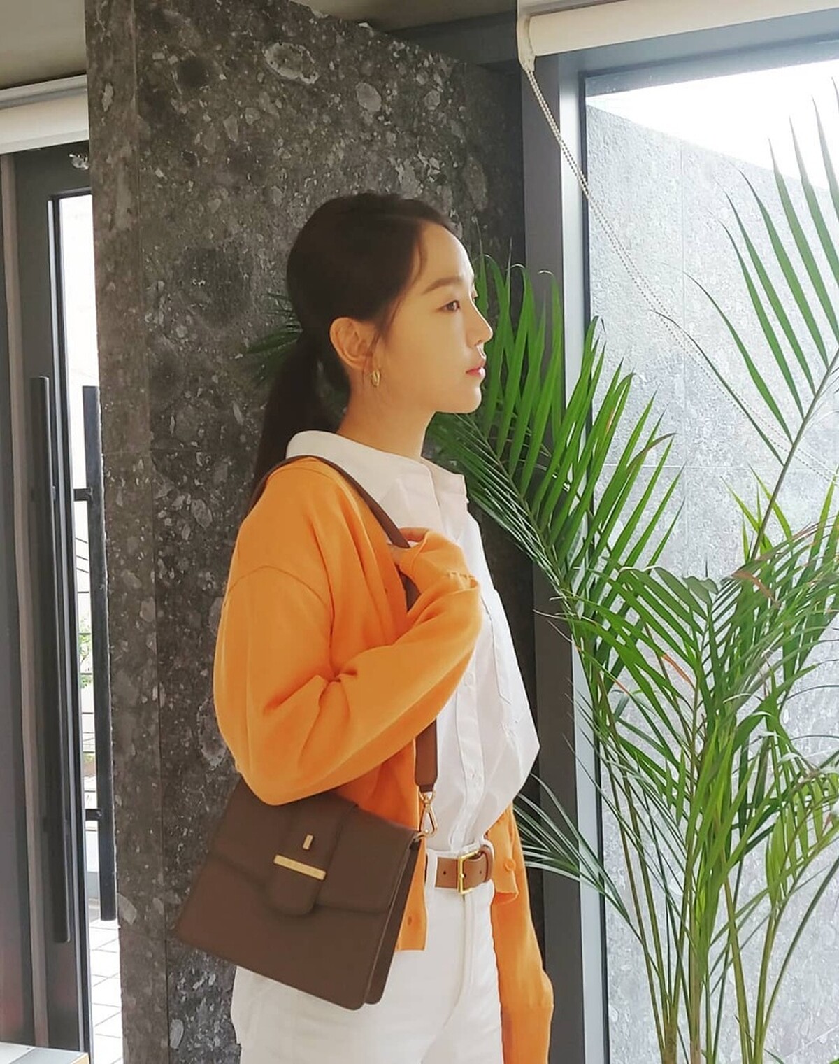 橘色開襟針織外套內搭白襯衫,下身選擇白色長褲與棕色皮帶,整體乾淨又明亮,這種「襯衫打底」的方式,能讓針織單品保有正式度,不會過於休閒,重點在於色彩呼應,棕色包款與皮帶可以讓暖色系穿搭更成熟又不突兀。