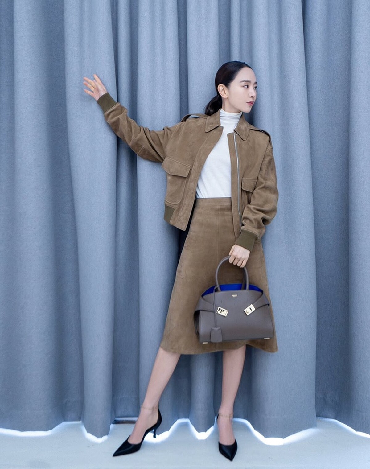 駝色麂皮短外套搭配同色系及膝裙,整體柔和又不失份量感,她用高跟鞋拉長比例,讓套裝不顯厚重。