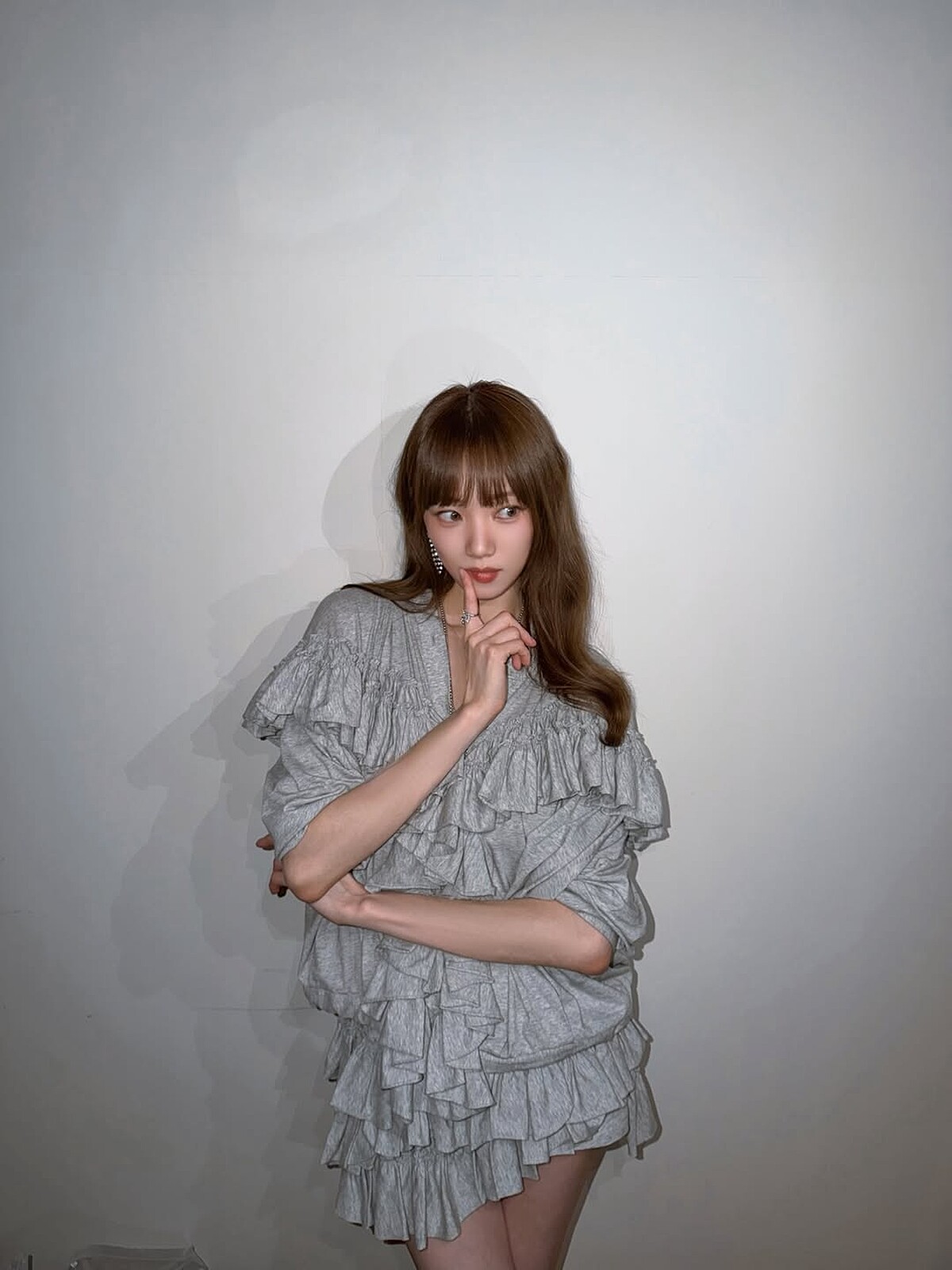 李聖經的穿搭不會太過浮誇或花俏,但是她相當懂得在細節處放大戲劇感。這件針織開襟衫做了小幅度的喇叭袖口設計,領口以一圈鑲繡小白花圈住,烘托李聖經細長漂亮的頸部線條,以小而巧的戲劇細節抓住氣質度;加上短版設計露出底下的白色短上衣跟一小截腰部肌膚,雖然是優雅沉穩的深灰色,依然帶有活潑俏麗氣息。
