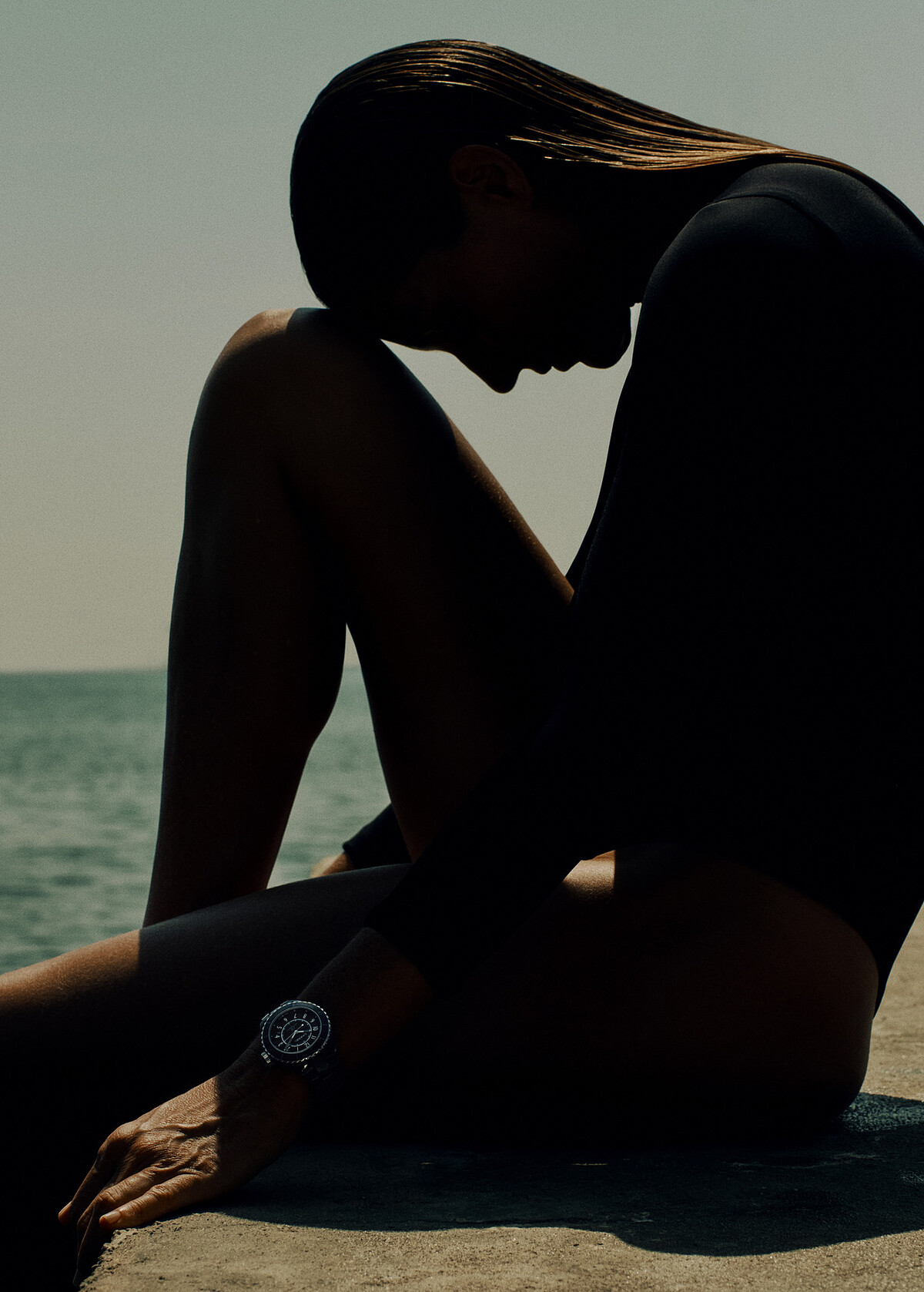 水上世界是J12的核心。時任品牌腕錶藝術總監傑克·海盧(Jacques Helleu),受競速帆船線條和海事冒險啟發,設計出Chanel首款運動腕錶,並選擇創新黑色陶瓷,其柔韌特性、流麗光澤、如絲觸感、服貼肌膚、調節體溫,耐受度是精鋼的七倍,卻更加輕盈,打造風格與實用兼具的J12。回應J12為鐘錶世界帶來的無畏創新,全球品牌形象與傳媒總監MARIANNE ETCHEBARNE 就說:「本次形象廣告為 J12 開啟全新關鍵篇章。我們的願景,是回溯 J12 的起源,突顯其在設計與精神層面上真正獨一無二的特質。水上世界始終是 J12 故事的核心,而透過這次形象廣告讓我們重返到這個開端,這份回歸更顯得格外深具意義。近期的品牌里程碑——包含 CHANEL 與世界頂尖划船賽事 The Boat Race 的合作,以及全新 J12 BLEU 的問世——皆啟發我們重新審視如何講述 J12 的故事。」