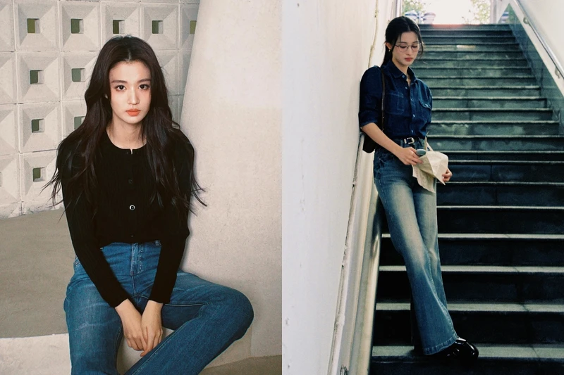 她也很擅長用丹寧襯衫、黑色針織開襟衫這類基礎單品打造氣質造型,丹寧襯衫搭配微刷色牛仔褲,整體同色系卻因為材質差異而有層次;黑色針織衫配深藍丹寧,乾淨又有點文藝感,重點在於版型選擇,她多半挑選微寬鬆卻不過大的剪裁,讓整體保有空氣感,而不是緊繃或厚重。