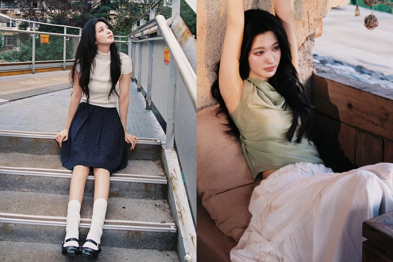 在較偏甜美的造型中,王楚然會選擇針織上衣搭配百褶裙,腳踩黑色瑪莉珍鞋與白襪,瞬間有種復古學院氣質,她的甜不是過度可愛,而是帶點文靜與清冷的風個,上身通常維持素色或柔和色調,下身用裙裝增加輕盈的份量感,再透過襪子與鞋子呼應整體風格,這類穿搭其實很好駕馭,只要避免過多裝飾,維持配色乾淨,就能穿出同樣的清新氛圍。
