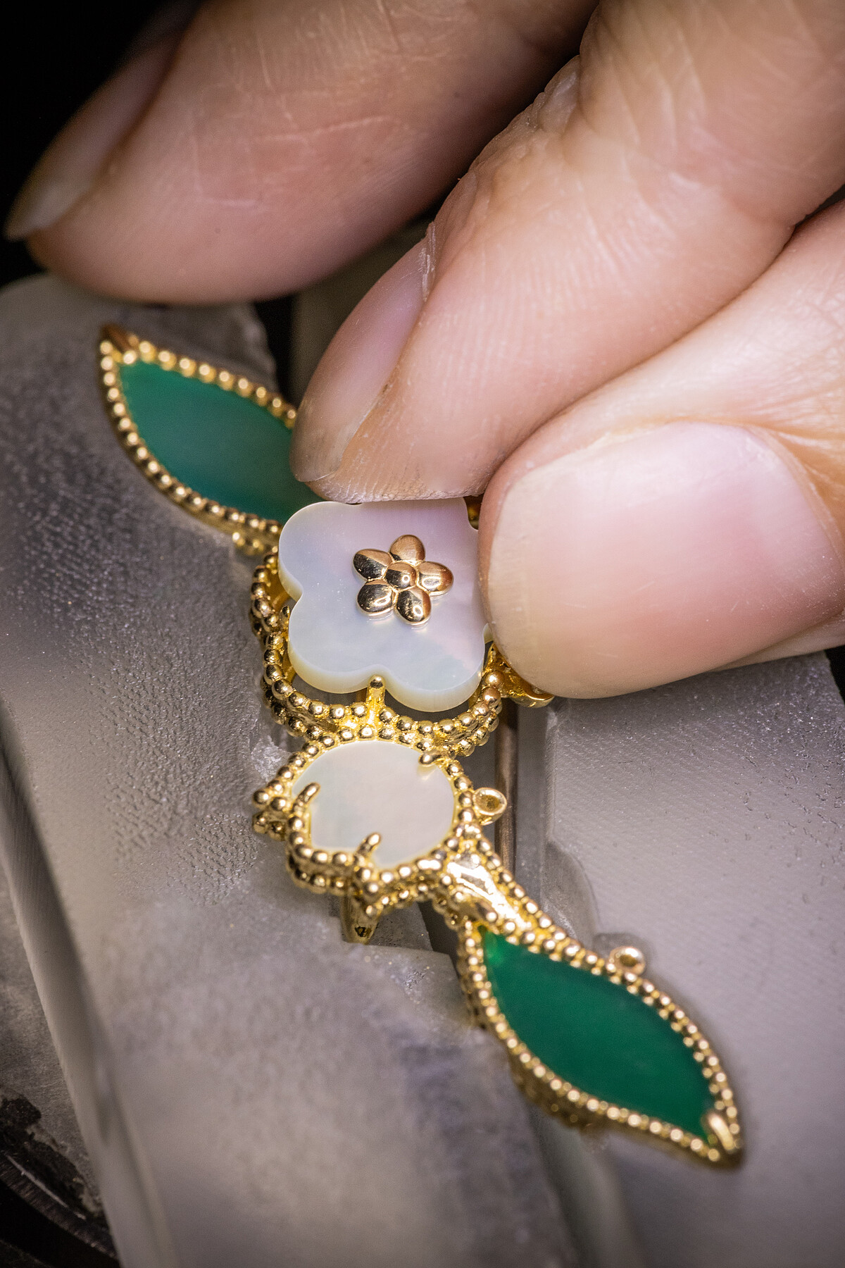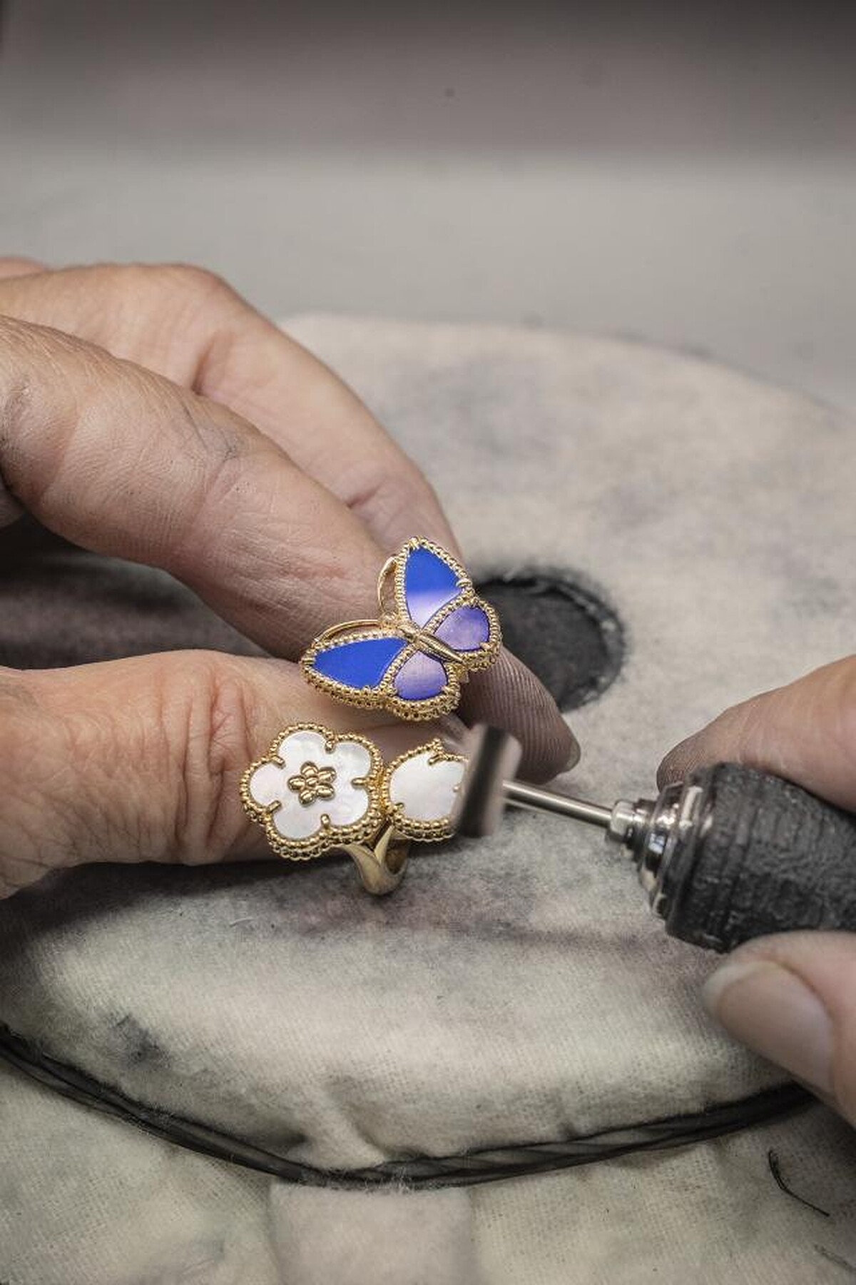 長項鍊、五枚圖騰的手鍊、胸針、 Between the Finger指間戒、耳環,共計五款新作皆以18K黃金製作,各自點綴上青金石和藍色瑪瑙的小蝴蝶、綠色瑪瑙的綠葉、白色珍珠母貝的梅花和鈴蘭圖案裝飾。工藝亮點以長項鍊為例:彩蝶有側面和正面的構圖增添活潑動態,其身軀和觸鬚以拋光黃K金鑄成,運用傳統脫蠟鑄模後再以手工潤飾,每一枚圖騰墜飾皆與標誌性的金質圓珠圍攏,凸顯品牌講究的美感細節與工藝價值。