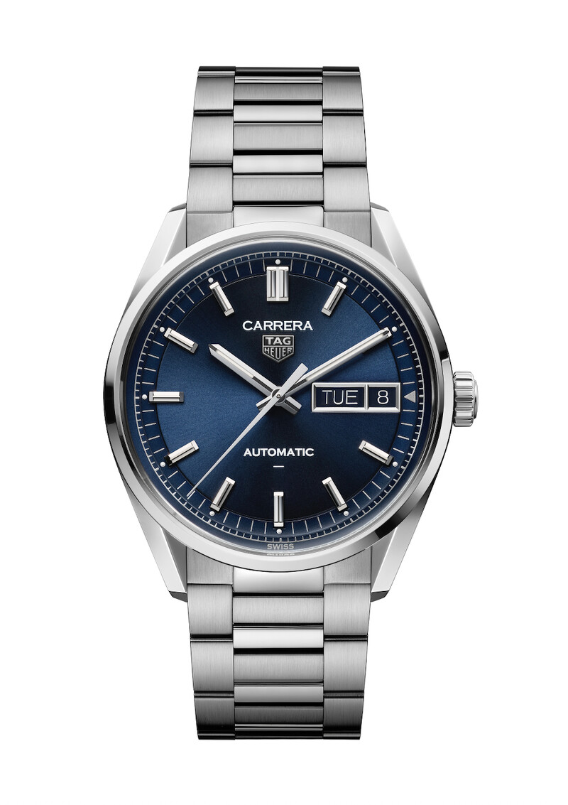TAG Heuer Carrera Day-Date 星期日期腕錶–藍面鍊帶款 :直徑41毫米,精鋼錶殼,黑色噴砂錶面,藍色太陽放射紋磨砂錶面,鍍銠拋光刻面時標和指標,以白色 Super-LumiNova® 夜光塗層,3 點鐘位置設有星期與日期視窗,精鋼旋入式藍寶石水晶底蓋 機芯:自產獨有 TH31-02 自動上鍊機芯, 功能:小時、分鐘、秒鐘、星期、日期,防水性能100米 錶帶:拋光磨砂精鋼 H 型錶鍊,配備快拆鍊節系統 建議售價:NT$143,700
