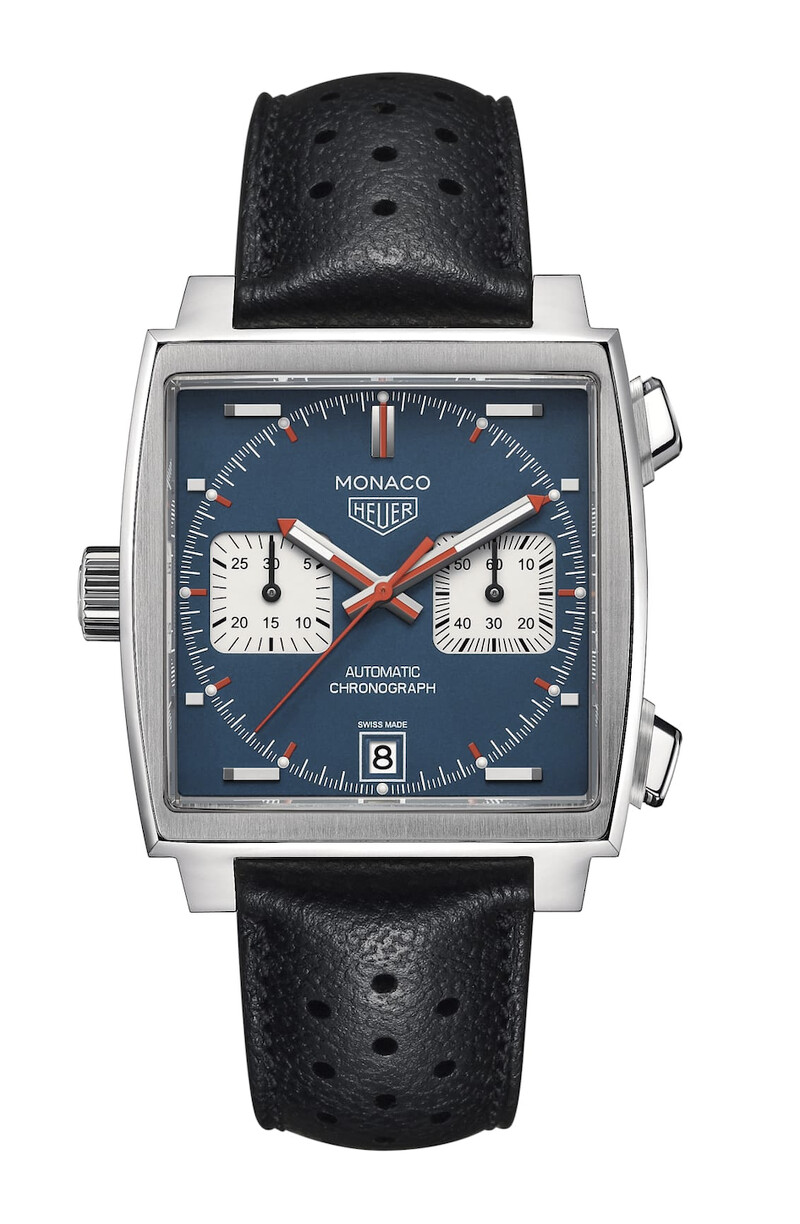 TAG Heuer Monaco 左冠計時腕錶 :直徑39毫米,精鋼錶殼,藍色蛋白石錶面,紅色與淺藍色指針,精鋼旋入式藍寶石水晶底蓋 機芯:Calibre 11自動機芯 功能:小時, 分鐘, 秒鐘, 計時功能, 日期腕錶,防水性能100米。 錶帶:黑色小牛皮錶帶 建議售價:NT$277,200