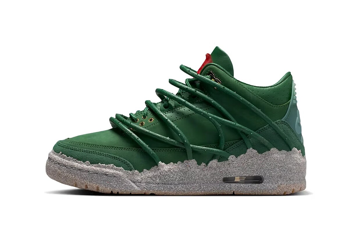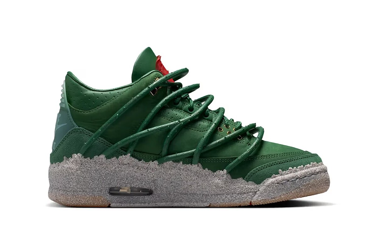 延續其過往鞋履創作所建立的視覺風格,「Concrete Rose」以象徵性花卉意象為核心,將個人故事轉化為細膩的設計敘事。鞋身選用低調霧面的深綠色皮革覆蓋,營造沉穩且極具搭配彈性的整體氣質;與之形成對比的,是帶有仿混凝土紋理質感的中底設計,象徵在壓力與現實環境之中依然綻放的生命力。在保留經典 Air Jordan 3 輪廓的前提下,設計並未走向張揚,而是透過精緻細節慢慢鋪陳主題。鞋身點綴低調玫瑰元素與金色金屬細節,使整體視覺更具層次。翻至後跟,標誌性的 Nike Air Logo 醒目呈現,讓這雙作品在創新與品牌傳承之間取得平衡。最後,更具故事性的細節則藏於鞋內。內襯印有「The World Is Different Here」與「Rose From Concrete」手寫字樣,呼應 Taylor 的人生軌跡;鞋墊鋪陳繁複玫瑰花瓣圖騰,延續整體敘事。鞋款並搭配特製金色鞋盒與玫瑰展示開窗設計,將開箱體驗也納入設計的一部分!