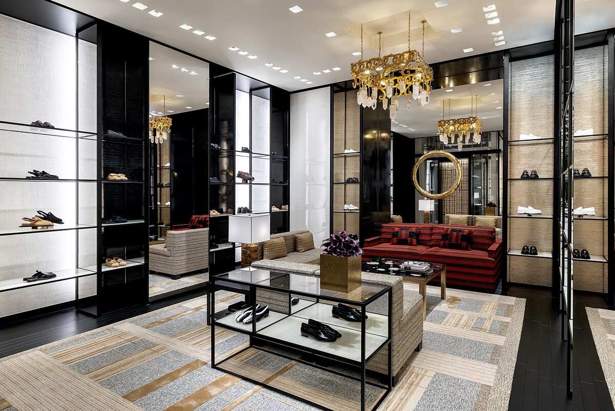 二樓集結所有鞋履設計,並針對顧客對於試穿鞋履較多的隱私需求,打造出比一樓更輕鬆、舒適的休憩空間。除了創意總監Matthieu Blazy操刀的出色鞋款,目光也不能放過藝術家 Nancy Lorenz 創作的金箔鏡面作品,以及Goossens 金銀工坊特製的華麗吊燈,不僅替空間提升了奢華層次,更賦予藝術靈性。