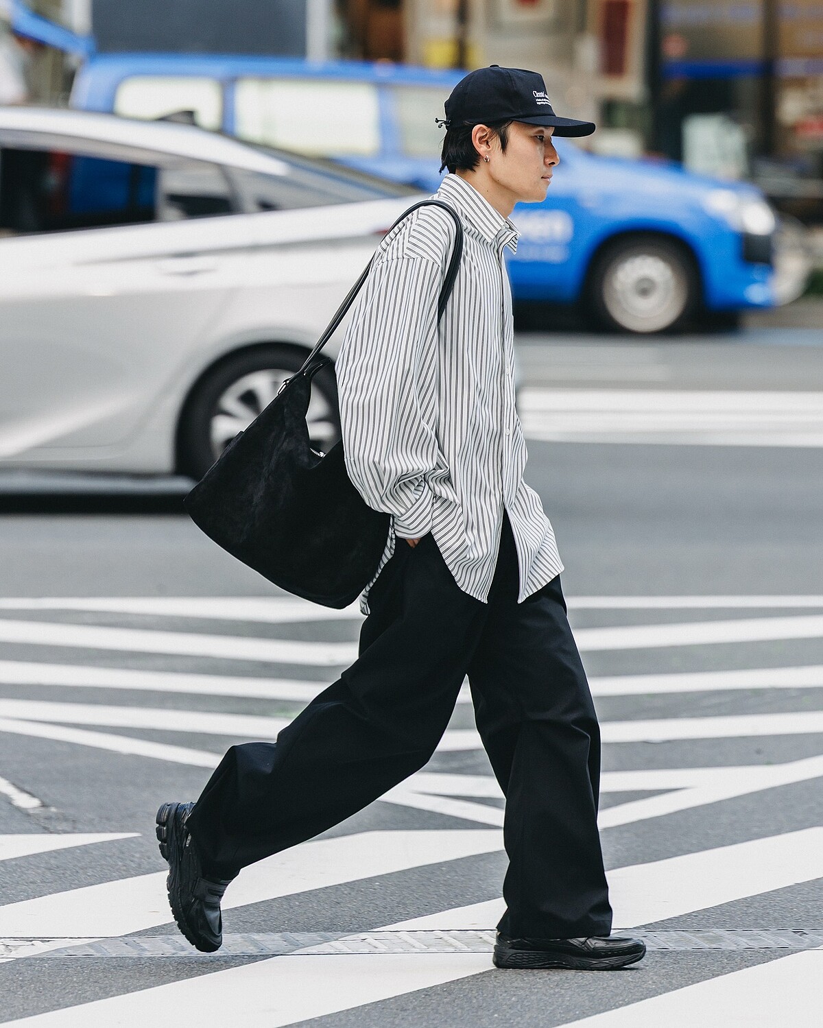 利用條紋襯衫增加視覺層次,搭配寬版西裝褲平衡正式感,最後用帆布鞋收尾,讓整體維持在剛剛好的日常感。