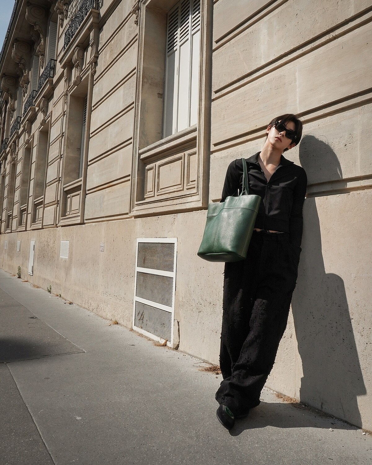 將襯衫紮進褲子是關鍵細節,可以讓整體看起來更乾淨俐落,搭配寬褲則保留一點隨性。