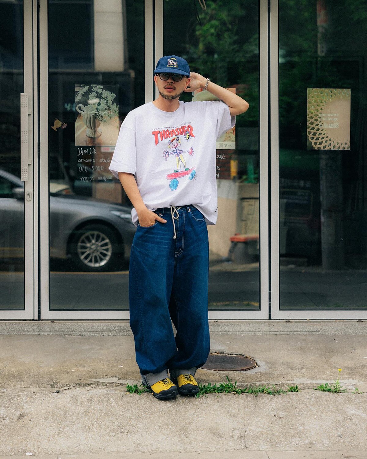 男生美系風格穿搭範例1:白T+藍色牛仔褲