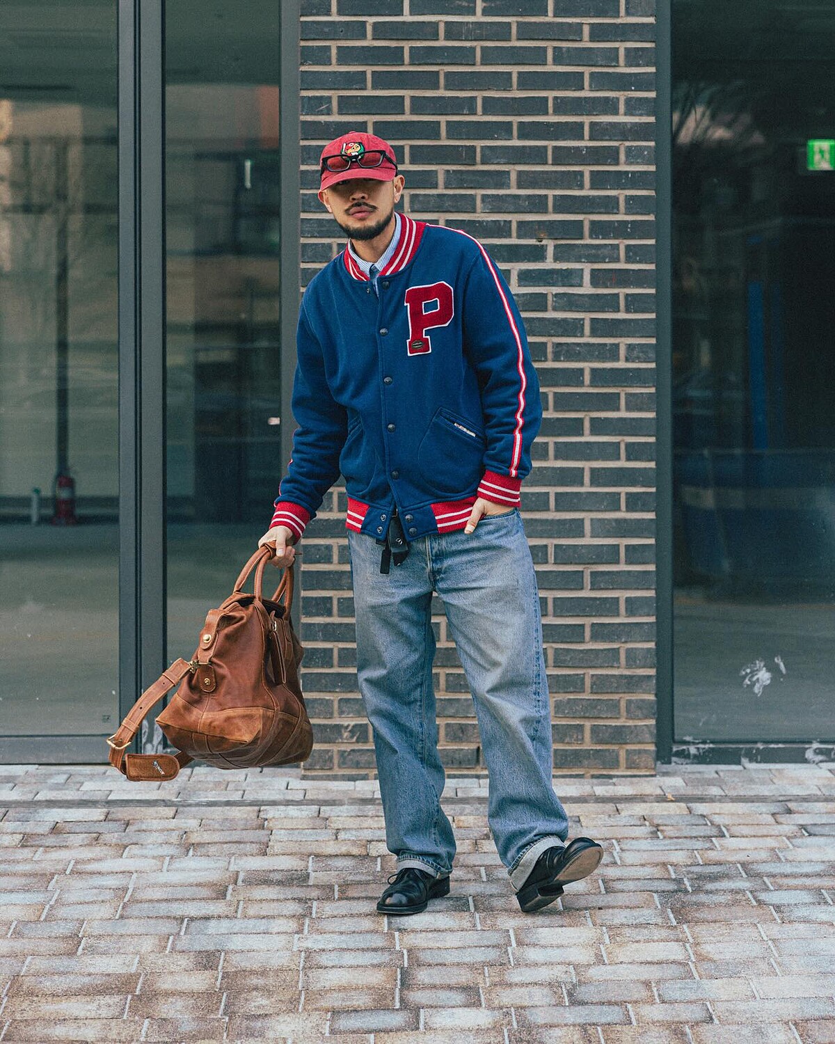 男生美系風格穿搭範例3:棒球外套+直筒褲