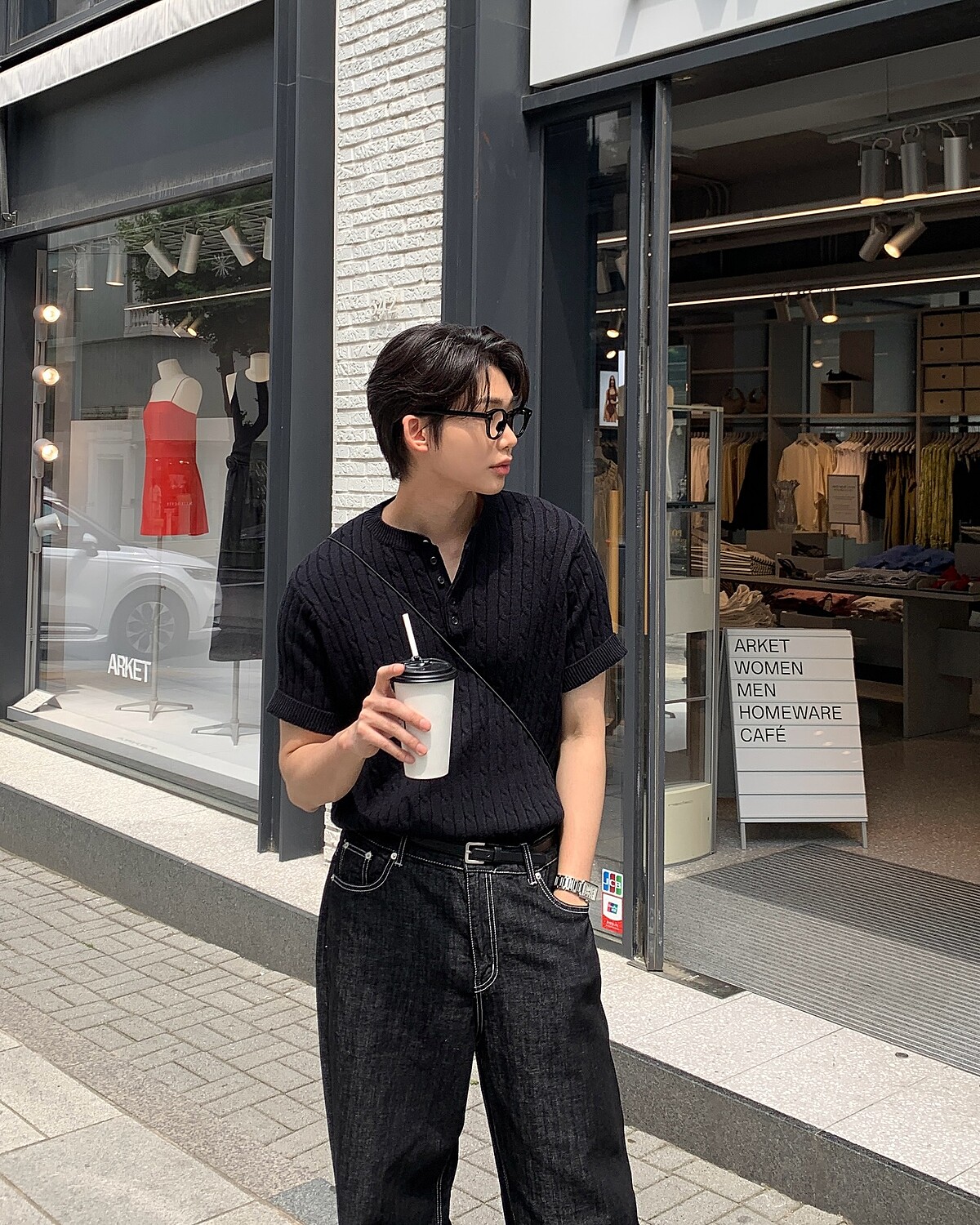 男生韓系風格穿搭範例3:合身針織上衣+直筒褲