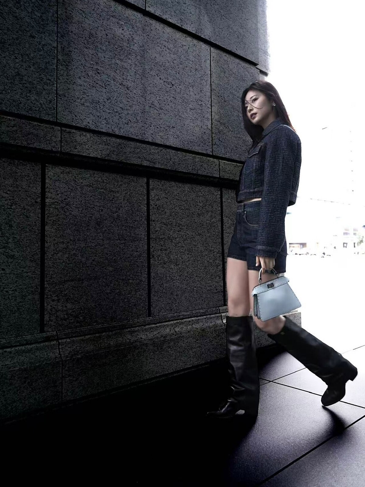 這次子瑜在台北街頭的造型,可以說是把輕鬆有型拿捏得剛剛好。一身FENDI FF Logo丹寧套裝,搭配黑色長靴,整體輪廓俐落又時髦,而整體造型最關鍵的亮點,正是她手上的FENDI Peekaboo ISeeU小型手袋。淡藍色的包款與牛仔套裝自然呼應,整體風格也因為粉嫩的藍色系更增添柔和氛圍。