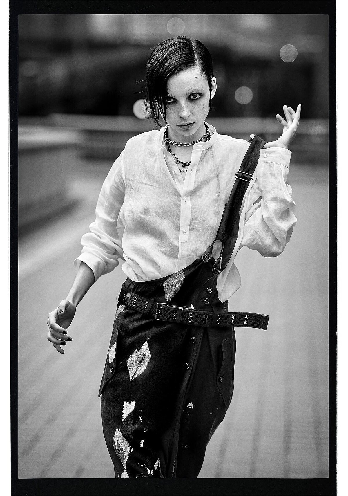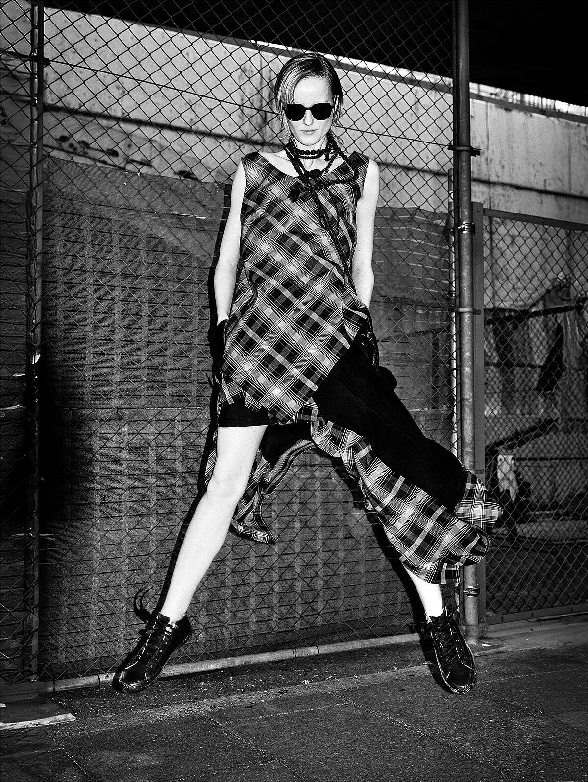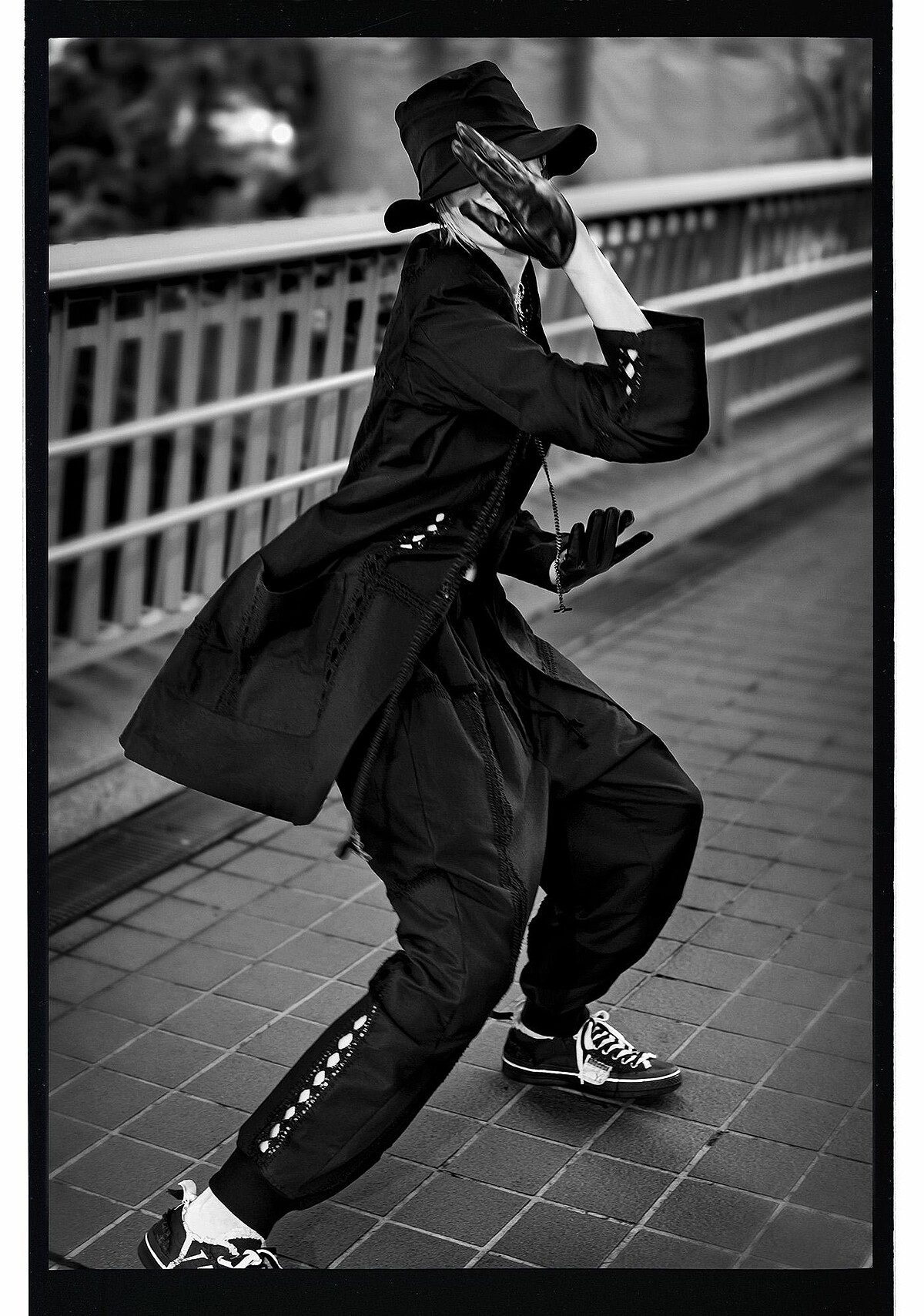 「最簡單的構圖,最強大的敘述。」在 Vadukul 的鏡頭下,黑色的布料不再僅是遮蔽物,而是刺破平庸都市景象的利刃。不對稱的剪裁與東京粗獷的街道紋理相互呼應,展現出「光影越紛擾,黑白越顯純粹」的極致視覺張力。