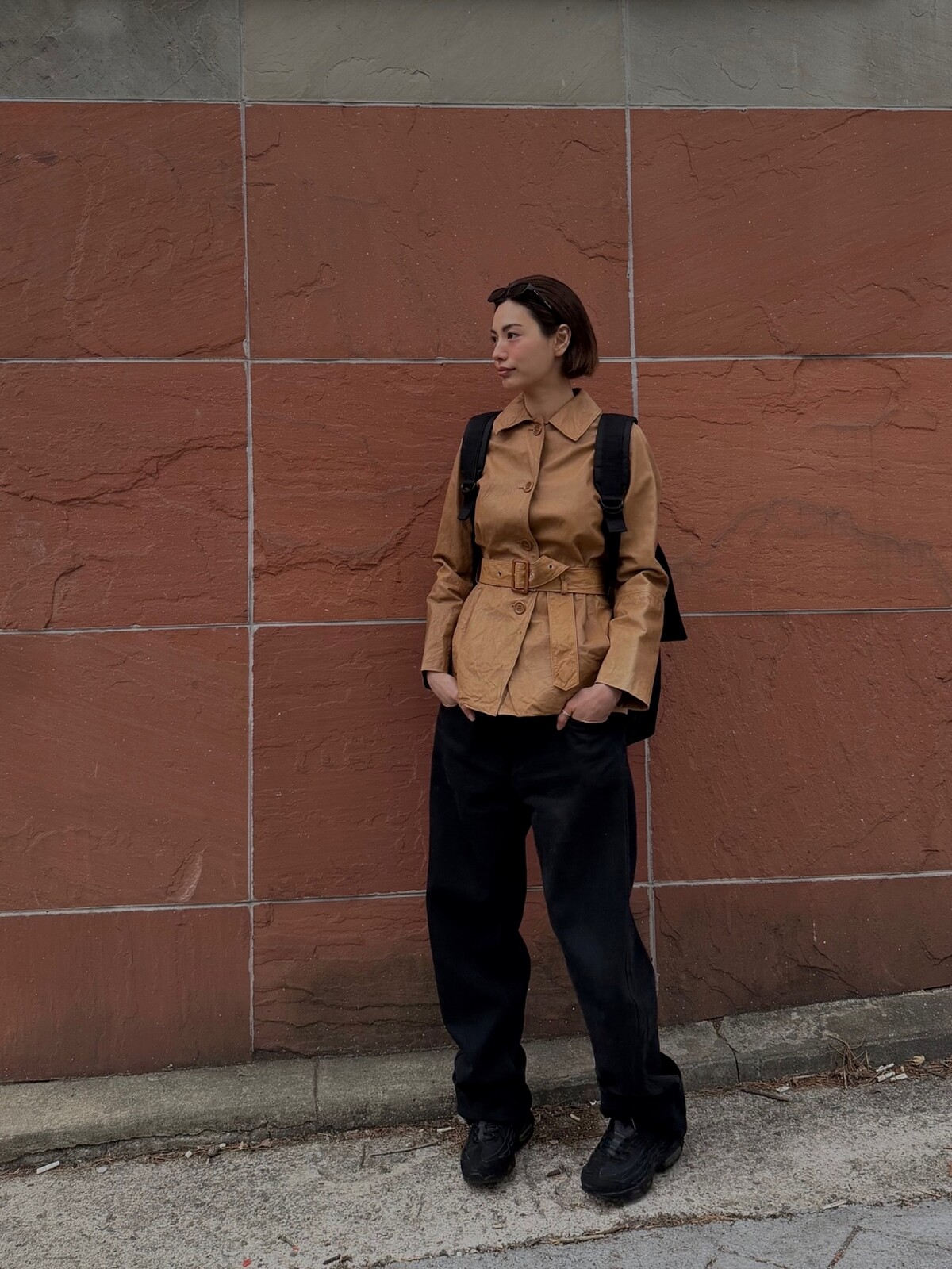 短風衣的穿搭在腰線的呈現方式和過去很不一樣,現在的收腰不再是強調曲線,而是一種比較放鬆的感覺,像是輕輕繫上的綁帶,收出空氣感的上身輪廓,這種做法讓整體造型看起來有結構,但不會顯得刻意,反而多了一種隨性的精緻感。