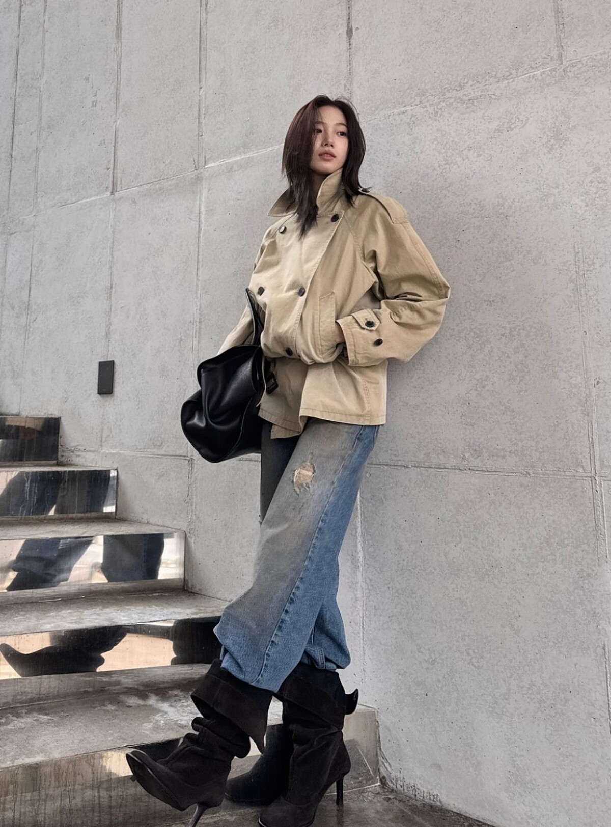 而短風衣剛好停在腰線附近的位置,讓視覺重心自然上移,整體看起來會更輕、更乾淨。這樣的比例不需要刻意強調身形,也能讓造型看起來更有精神,特別是在搭配寬褲或長靴時,那種上短下長的對比會讓整體顯得更有層次。