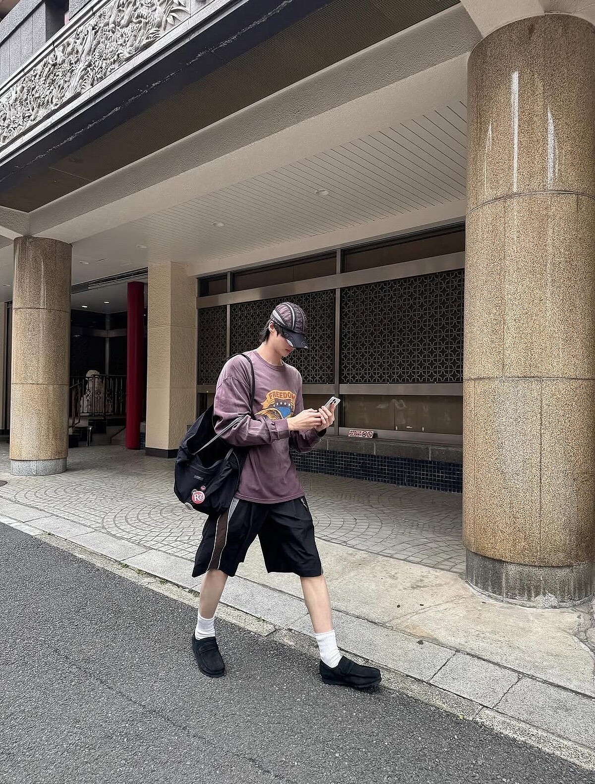 邊佑錫私下曾穿著台灣品牌NAMESAKE的一款拼接運動褲,與美式圖案T恤、Clarks袋鼠鞋搭配,營造出一種輕鬆自然、鬆弛率性的私服氛圍。