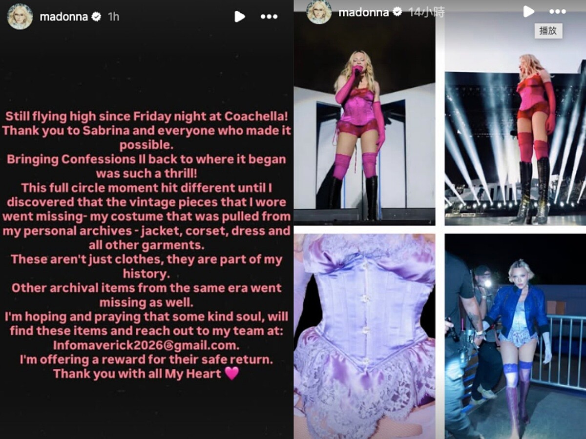 然而,演出結束後,瑪丹娜在IG限時動態中曝光了一件大事。原來當天演出後,她從私人珍藏中帶來Coachella的復古演出服都不翼而飛,其中就包括20年前的外套、馬甲、洋裝與多套服裝。她特別強調,這些並非一般舞台造型,而是「歷史的一部分」。
