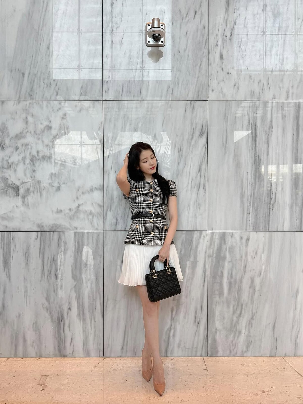 說到能代表上流、優雅、質感、氣質……等等氣質的配件,Lady Dior絕對是不二選擇。IU在劇中提的這款小型Lady Dior手袋是經典的黑色Cannage籐格紋款式,搭配千鳥格紋無領衫、白色百褶短裙,簡單又有層次地帶出財閥千金的高貴氣質。