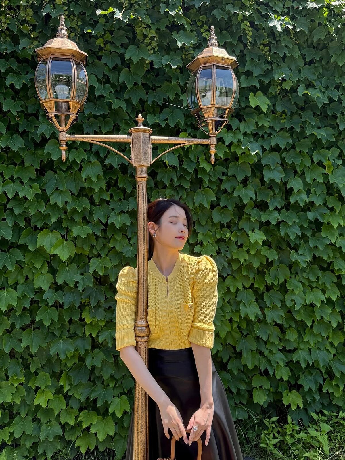 另一個IU劇中角色常用來穿搭的單品是針織開襟衫,可以說是氣質女孩的百搭單品。穿著針織開襟衫時,可以自由內搭T恤、襯衫等等輕鬆打造層次感,也可以在春夏季單穿。在這裡IU選了肩部線條稍微澎起的款式,讓身材嬌小的她顯得上身更有力量,同時在視覺上縮小頭部比例,打造小臉美人效果。