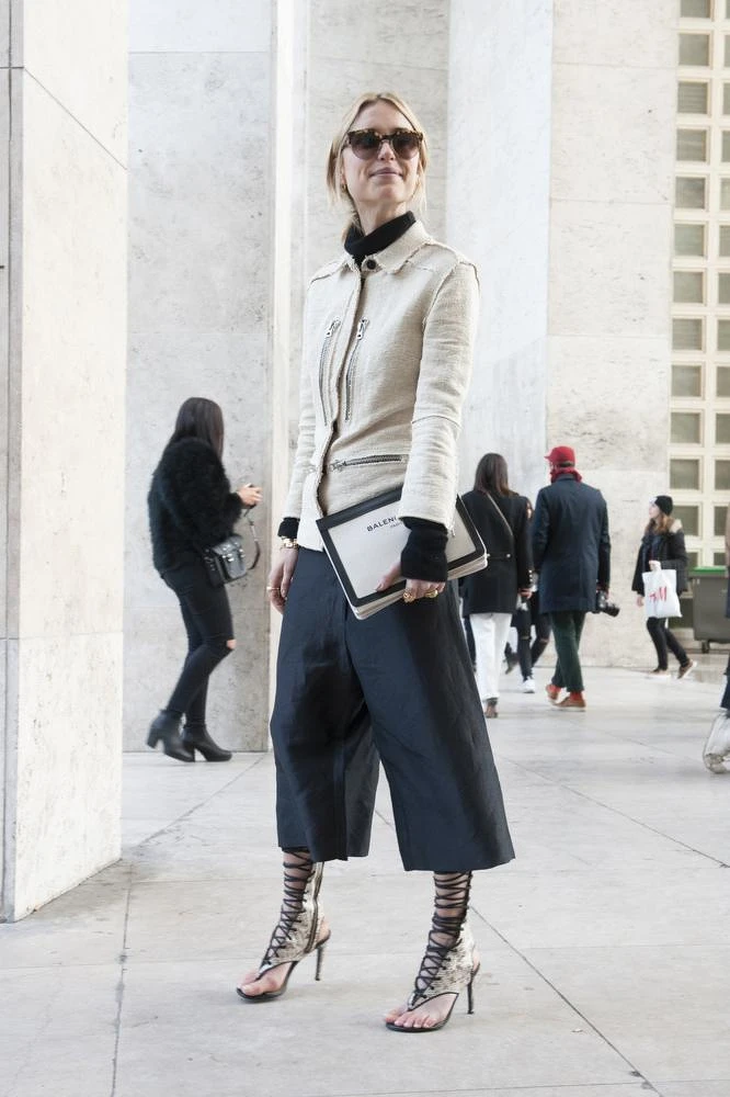 除了及地的長度外,落在小腿肚上的褲長(Culottes 褲裙),也是時髦街拍客非常喜歡的新選擇。然而講求時髦,也不能忽視整體比例的重要性,此時一雙高度得宜的性感高跟鞋,正是成就完美造型的重要關鍵。