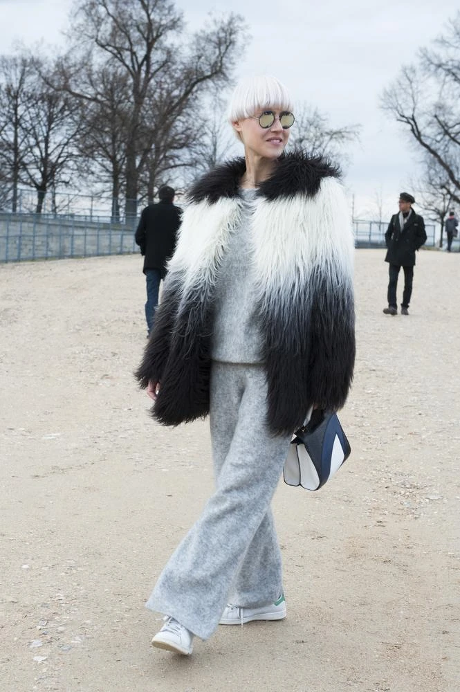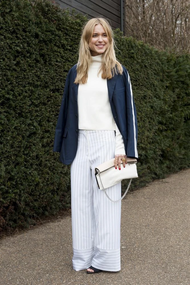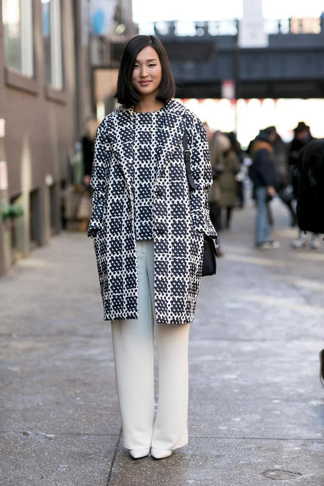 多才多藝的紐約潮女 Leigh Lezark 果然品味過人。她示範以「短版上衣」搭配帥氣寬褲,正是時下最具話題的造型輪廓。利用短版上衣露出腰線,能平衡寬褲的視覺重量。總認為白色褲裝會顯胖的朋友,或許可以嘗試這種寬版線條,絕對有意想不到的效果。