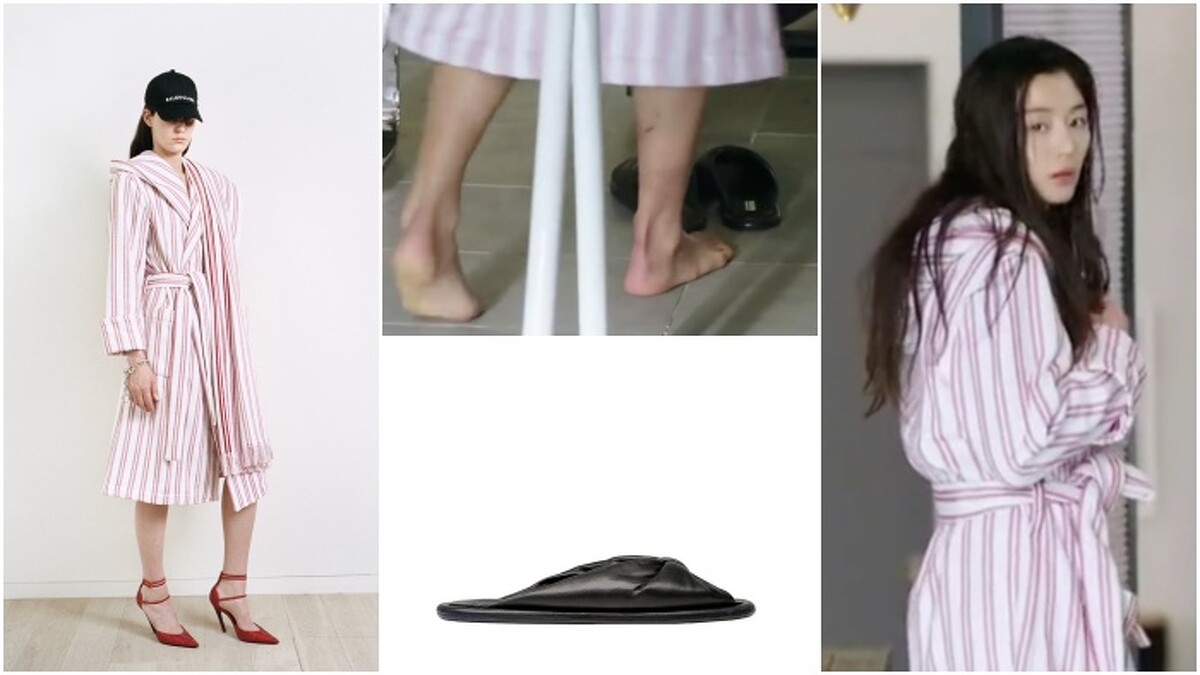 為了維持心臟跳動,到游泳池充電的沈清,不小心被發現是人魚的秘密!為了消除俊宰朋友的記憶,換上這身BALENCIAGA 17春夏系列的長袍外套和皮質拖鞋!
