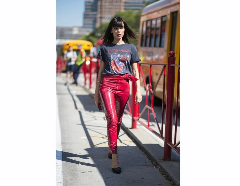 不喜歡太複雜的款式?沒關係,就用緊身漆皮褲搭配最近很火紅的圖騰 T,腳踩跟鞋再配上一抹紅唇,龐克也可以很有女性魅力!
