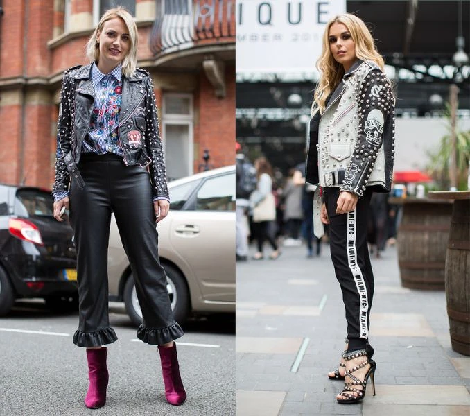 皮衣夾克絕對是龐克造型不可或缺的必備單品,佈滿整件外套的鉚釘更是大聲向世界宣告你的品味信仰!不過再搭配的時候要注意,下半身儘量用同色系且較簡單的款式去搭配已經很複雜的外套,才不會從霸氣酷妹變俗氣阿姨!