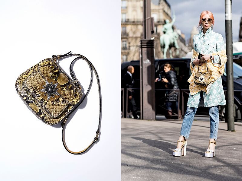 一頭粉紅髮色的韓國知名部落客 Irene Kim,在時裝週間成為了最亮眼的街拍明星。在 Miu Miu 全新女裝發表會場外,她以一身粉嫩色彩與花俏圖騰,展現出絕佳的混搭品味,而手上的蟒蛇紋 Dahlia 包,不僅毫不衝突,反而讓整體造型又多了一絲張力。