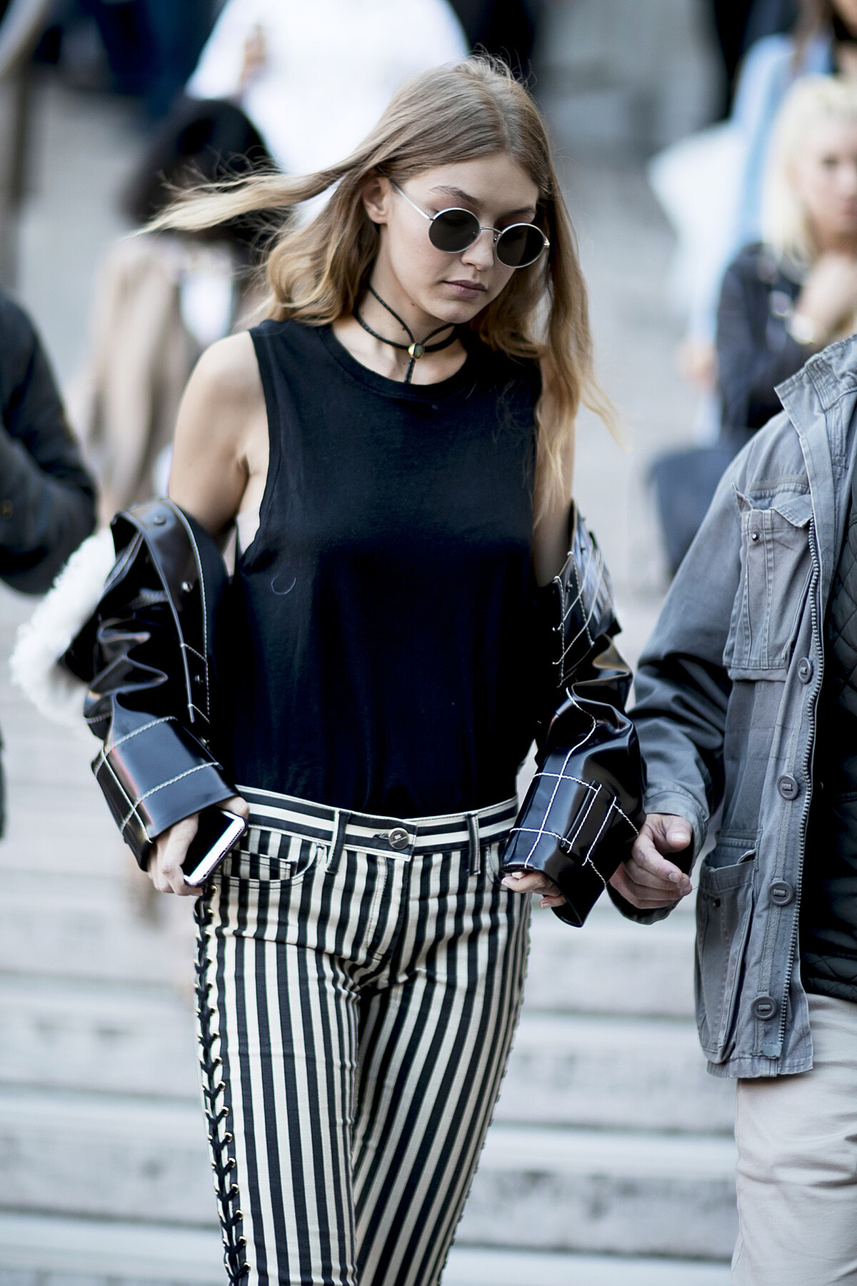 喜愛條紋的女孩也可像 Gigi Hadid穿上極踝的闊腿寬褲,讓直條紋與褲子的長度合力拉長視覺上的腿部比例,另外像是短版上衣的搭配更使身形看起來更加纖細。