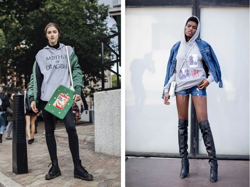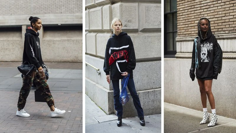 黑色連帽衫給人叛逆搖滾的感覺,上面帶有放大文字標語或是圖案噴漆的款式都很容易穿出街頭感,迷彩紋、丹寧褲、甚至下身失蹤的連衣裙式搭配短靴,都很容易上身(別忘了黑色是最修飾的顏色!)
