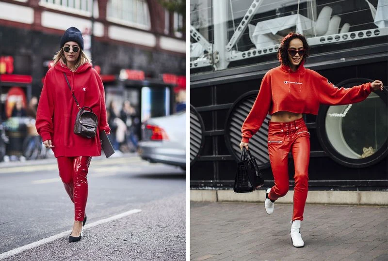 同樣是一身紅搭配皮褲,長版 V.S 短版就可以呈現完全不一樣的效果!長版的連帽衫容易給人太慵懶的感覺,可以試試在胸前掛上短斜背包產生視覺延伸的效果;而看起來俏皮年輕的短版連帽衫,搭配手提包跟短靴讓造型更加俐落!