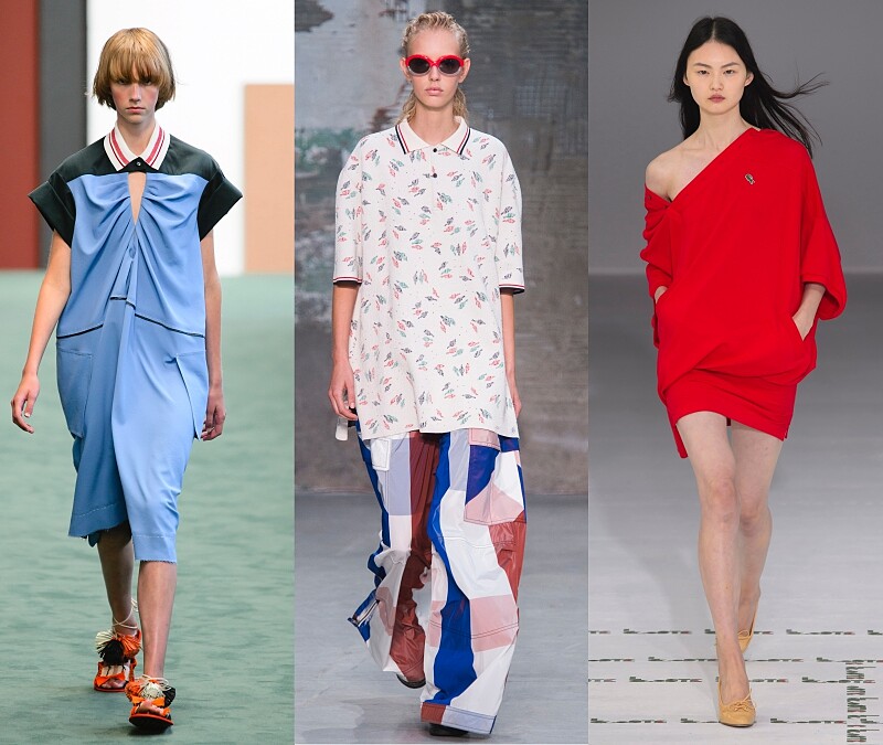 本季時裝秀上,Carven 就以長版 Polo 衫為原型,巧妙利用胸前與腰間的抓皺,展現出玩味十足的輪廓。Marni 則是保持一貫怪女孩的姿態,搭配如桌巾般的寬鬆印花長褲,復古況味滿點。而Lacoste 在秀上將胸前鈕扣全開、打造落肩感的小露性感,也是可重點筆記的造型方式。