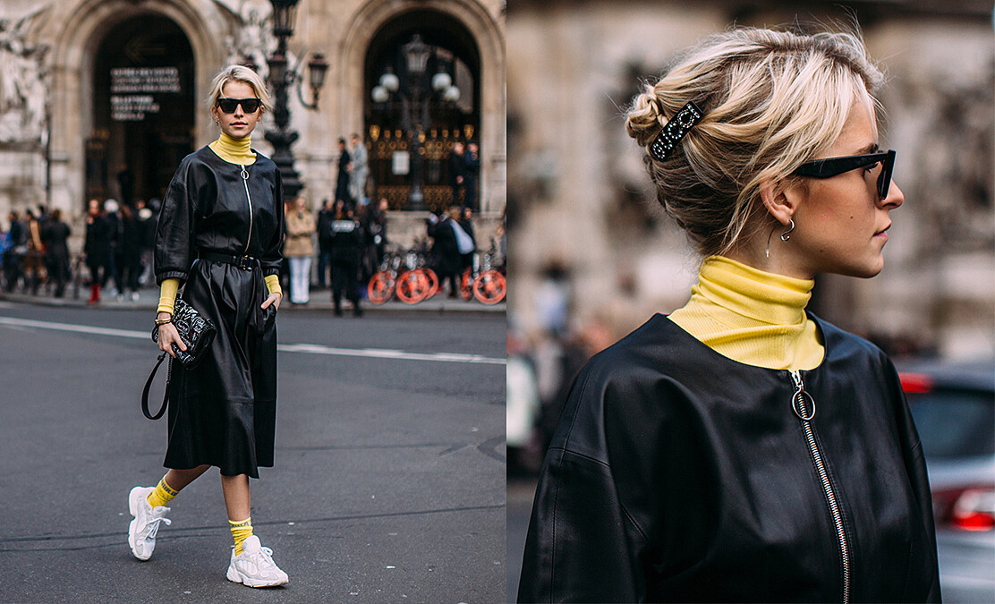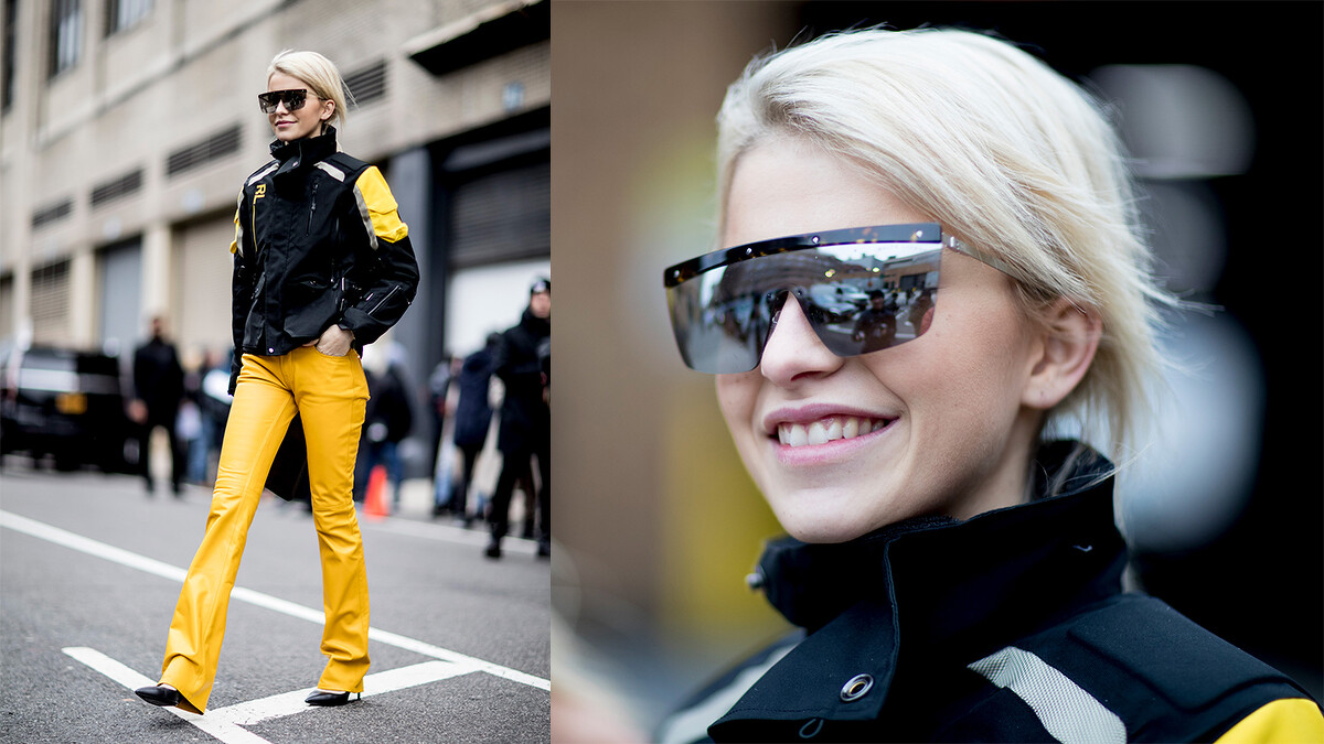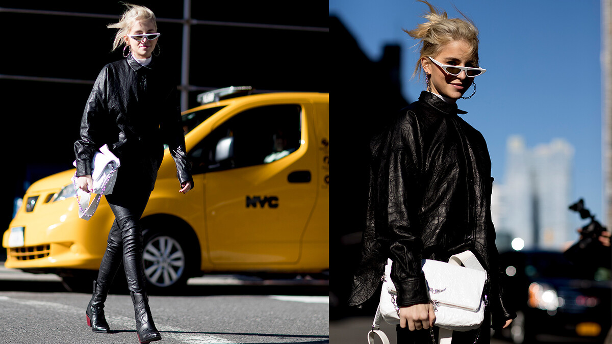 一身皮衣勁裝的Caroline全身上下只有黑白兩色,黑色的服裝將一路將身材線條延伸至雙腳,在眼鏡包款選用搶眼的造型和對比色將個人獨特時髦態度演繹的恰恰好!