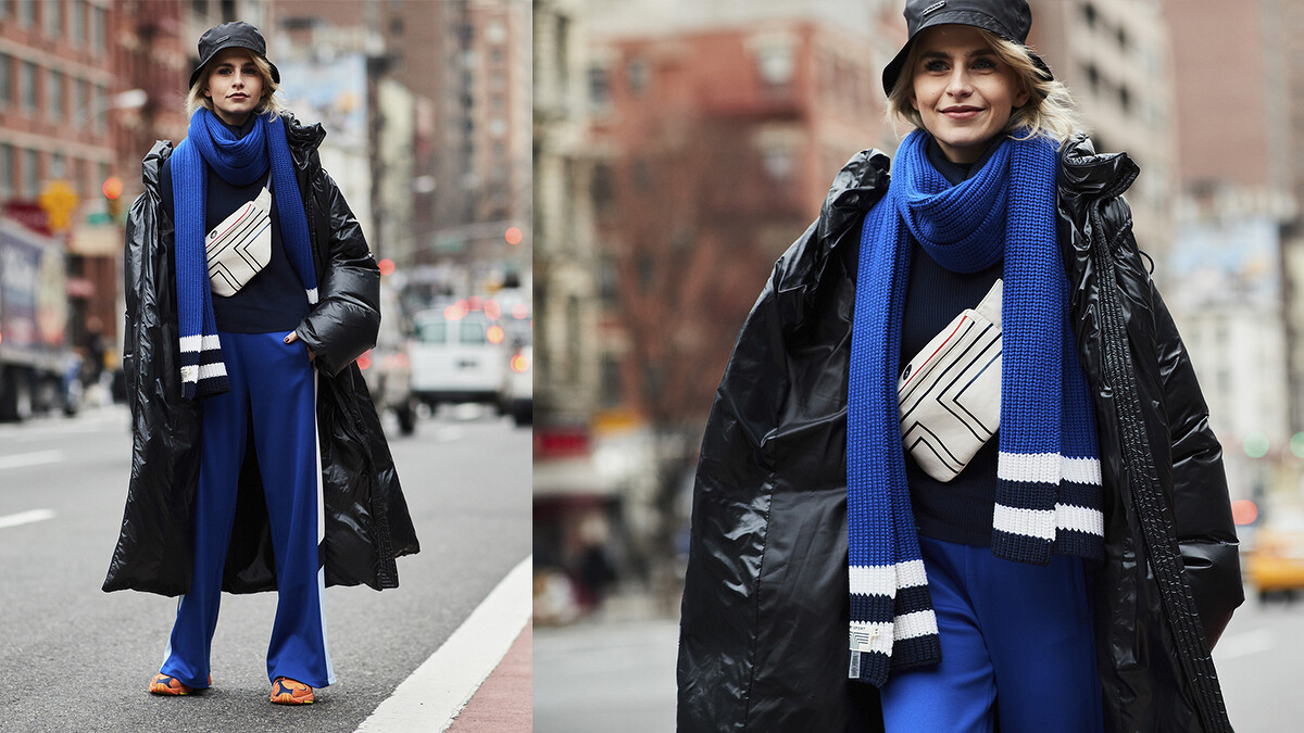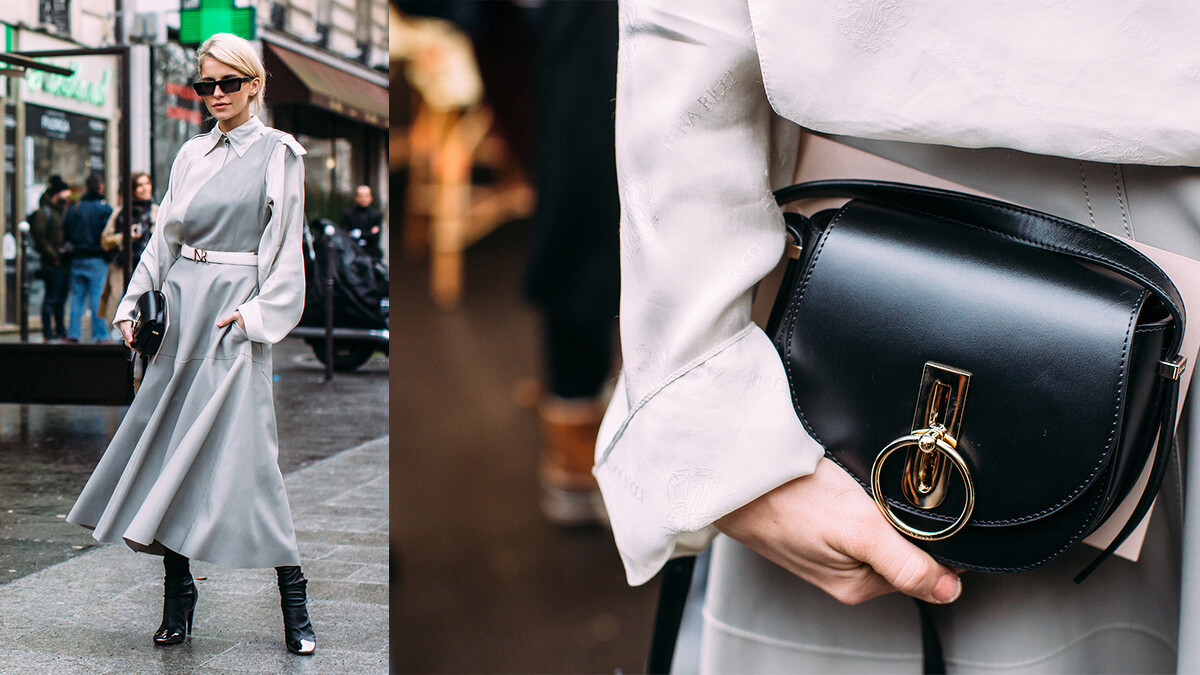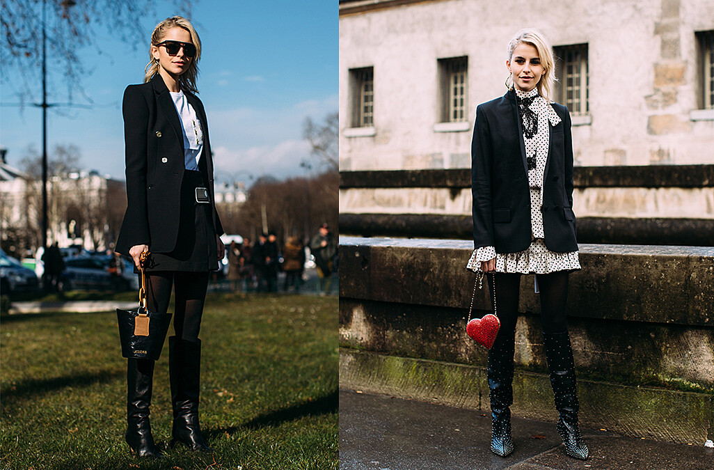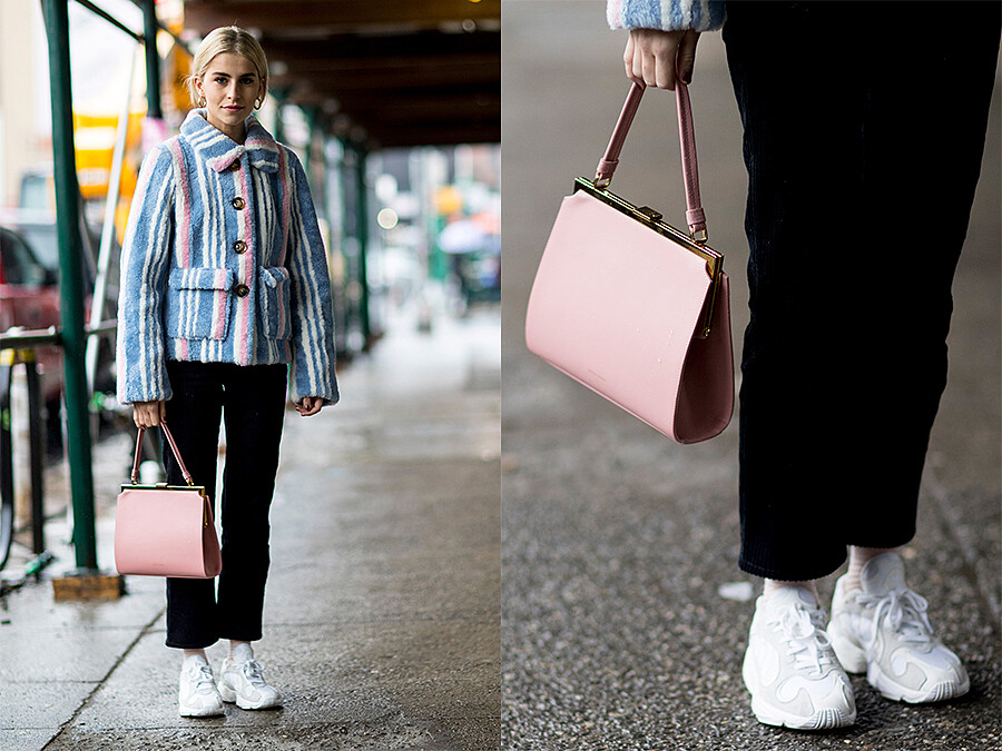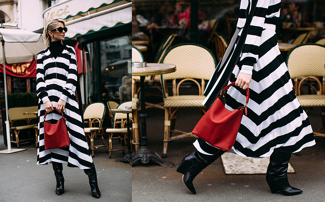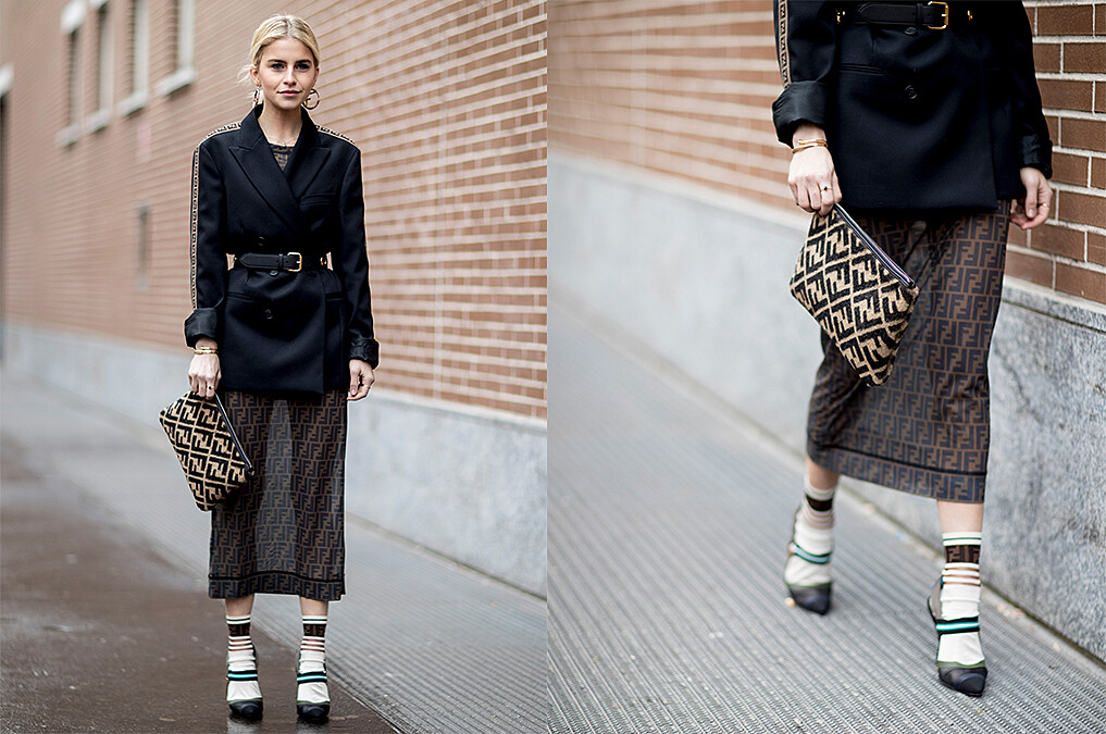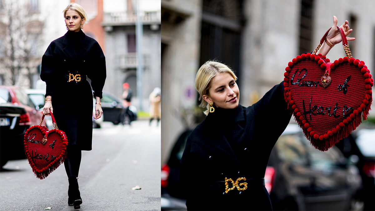 擅長抓住街拍攝影師眼球的Caroline Daur一身黑到底的羊腿袖洋裝看起來超復古之餘,混搭街頭味十足的大LOGO寬腰帶和古怪可愛的愛心包這樣的衝突感讓人一眼就愛上!