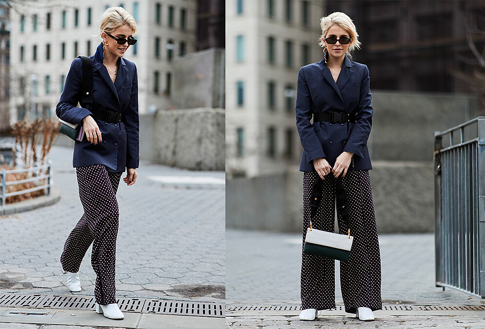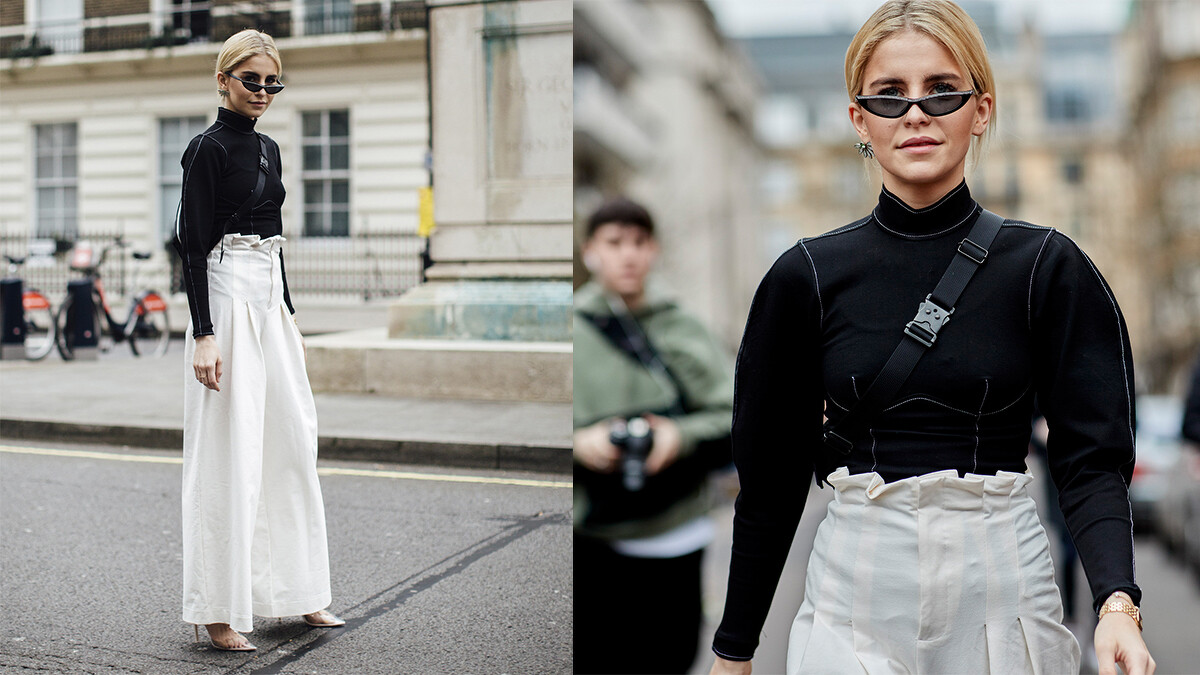 高腰打褶寬褲就不必多說了吧?可以參考Caroline Daur身上在腰頭做些波浪打褶造型的款式,紮衣服的時候才不會在衣服和褲頭之間擠出尷尬的界線。