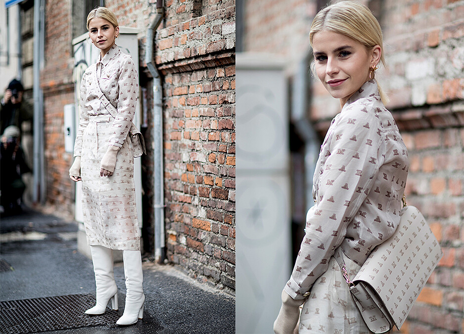很多時候我們都以為要看起來高挑顯瘦要選擇緊到爆炸的貼腿靴才可以修飾比例,顯然Caroline Daur就不這麼認為。淺色系的印花裝搭配寬管靴反而模糊了小腿真實長度,整個人看起來超顯高。