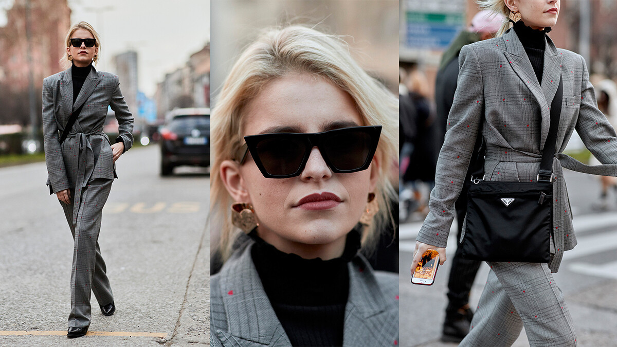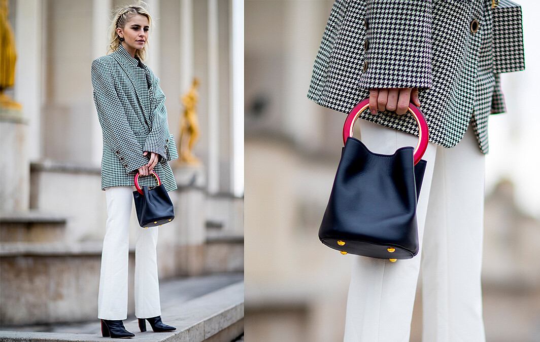 擅長精彩混搭不同年代感的Caroline Daur將復古輪廓的千鳥紋西裝和簡約摩登的手提包搭配得無懈可擊!注意到了嗎?好漢不提當年勇,哈比不提大包包。