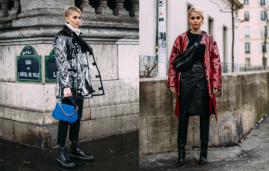 今年席捲時尚圈的塑料材質一不小心就會有太澎湃太Over的大型感,就讓它成為整身唯一的重點,弱化其他色調與重點就能穿得毫無違和。
