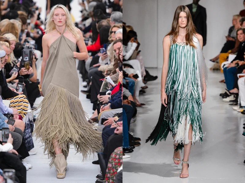 駝色的繞頸洋裝下襬以豐厚的的流蘇帶出民俗氛圍、渲染上漸層色的流蘇洋裝顯得春意盎藍…各式各樣的流蘇設計為服裝添增了優雅的條紋紋理,展現絕佳的裝飾效果,成為今年春夏最新的必備細節設計!