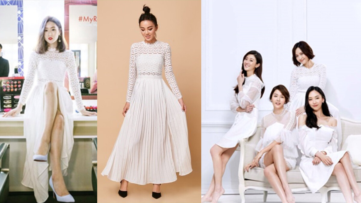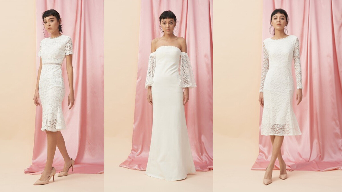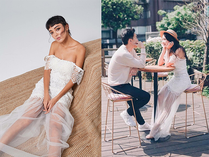 露肩款的一字領長洋裝,適度露出肌膚展現成熟的性感。柔軟的睫毛蕾絲在純白下顯得格外清新脫俗。