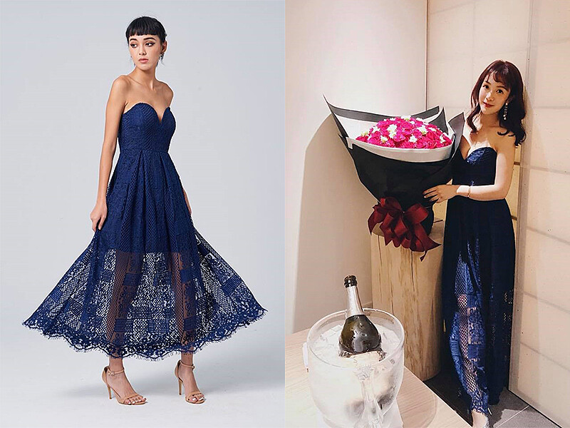 性感的最佳利器就是若隱若現的透視感了!寶藍色蕾絲洋裝以馬甲式的桃心領上身搭配大圓裙,每一次的擺動都展現了閃耀的浪漫。