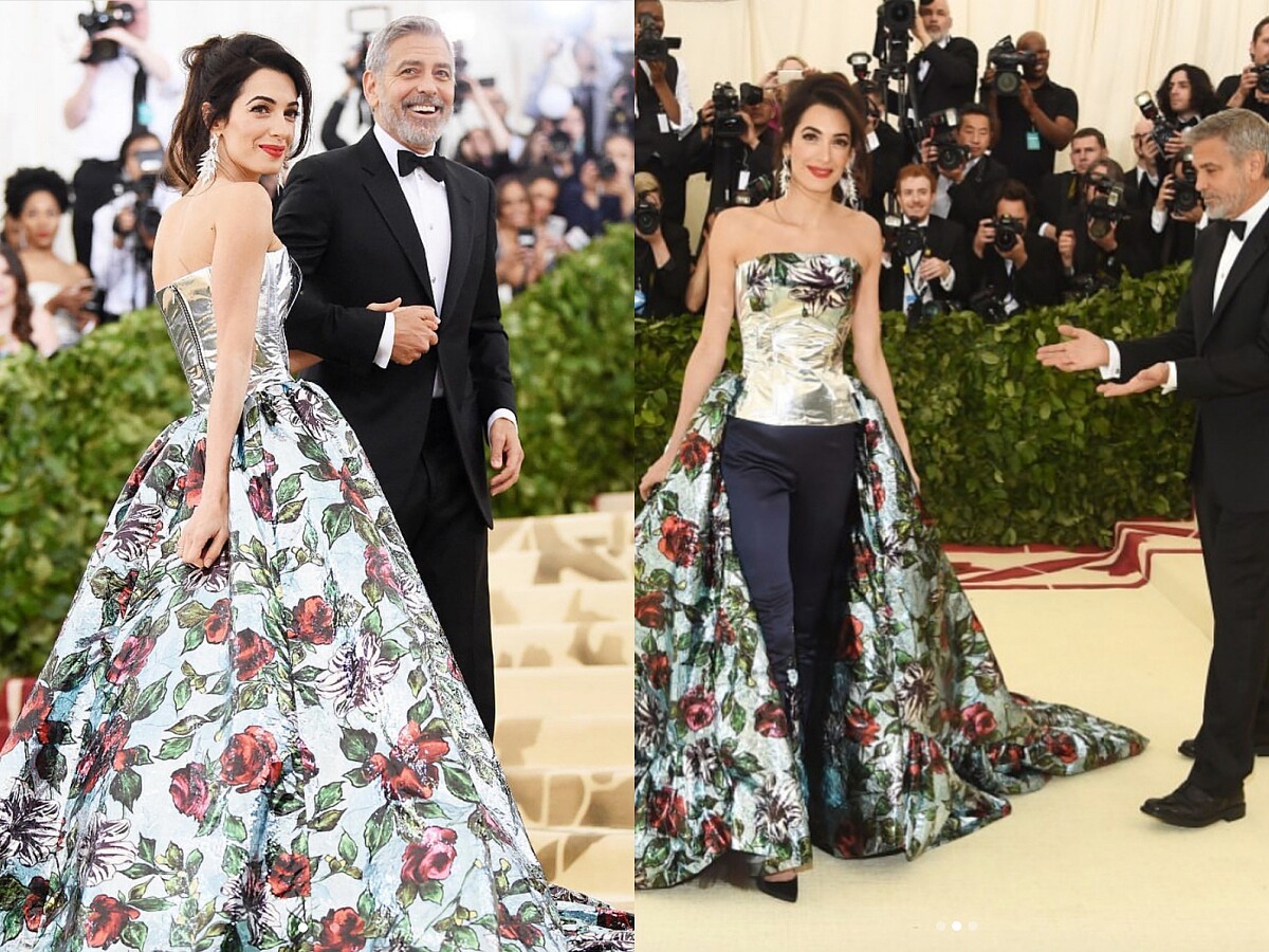 側面、背面看以為是一件印滿玫瑰的澎裙禮服,但一轉身即發現其實是一件暗藏玄機的褲裝造型,如此獨特的設計使Amal Clooney能大方旋轉、走動出迷人的帥氣姿態,大贏身旁George Clooney的光彩。