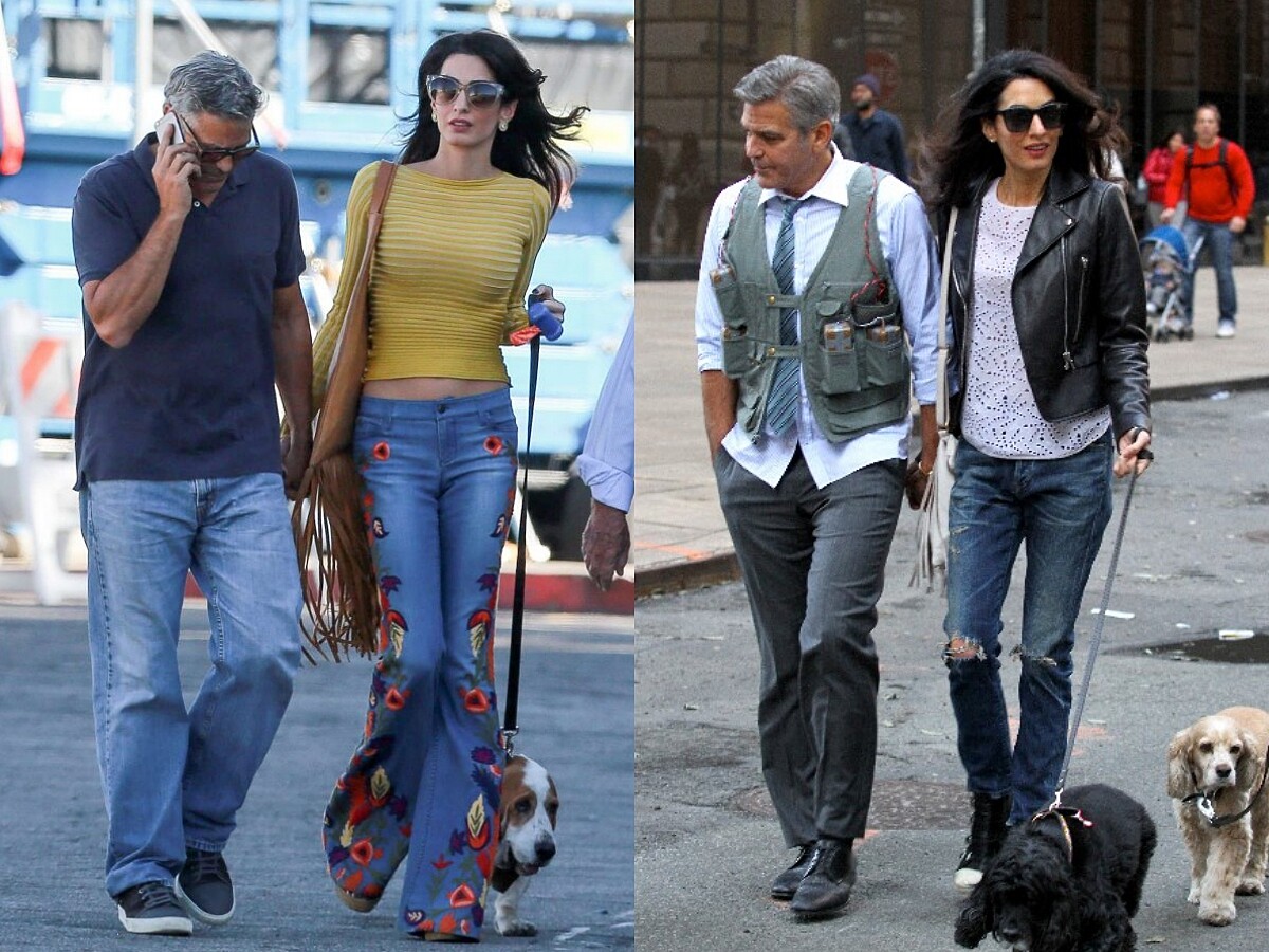 熱愛狗狗的Clooney夫妻檔,私底下在帶他們出門散步時也依舊時髦有型!貼身剪裁的黃色橫條紋上衣在Amal Clooney身上不但不顯胖,搭配的刺繡丹寧喇叭褲使整體顯現出70 年代的復古風華; 破損丹寧褲、騎士皮夾克、高筒休閒綁帶鞋,盡顯出Amal Clooney酷帥的一面,而雕花上衣則保留了Amal Clooney本身的優雅,然而George Clooney依舊選擇喜愛的襯衫裝束,只是這回他脫掉西裝外套、換上彷彿FBI的防彈背心,展現玩味態度。