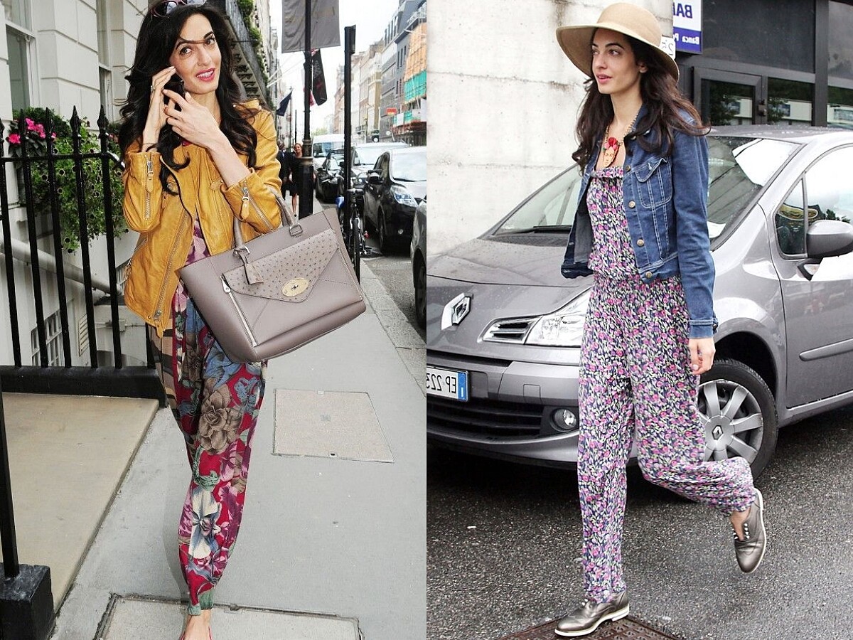 看似花俏、甚至有點老氣的印花鬆緊褲裝,在Amal Clooney身上反而不顯老,瀰漫出的是充滿異國風情的愜意氛圍,和對比色的黃色夾克、或是百搭款的丹寧夾克做為搭配皆超級合宜!
