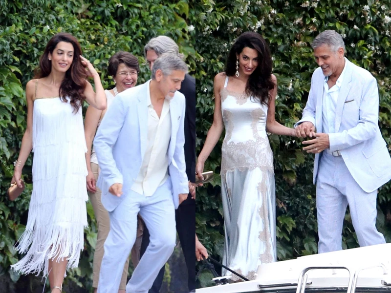 無論是隨著韻律擺動的流蘇洋裝、或是低調閃爍的雪白絲綢洋裝,皆散發出天使般的純潔迷人,搭配上Amal Clooney的浪漫大旁分捲髮更是著迷,而George Clooney也特意穿上天空藍的西裝裝束、配上純白的襯衫,共展浪漫的清新格調。