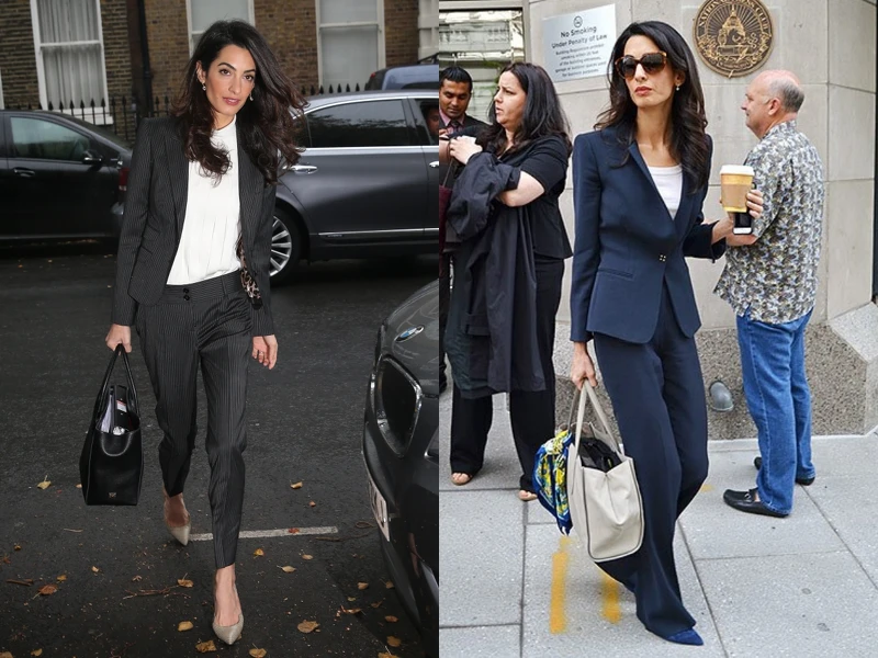 身為律師的Amal Clooney,在面對嚴謹的辦公場合時則會穿上暗色系的西裝裝束,除了展現對職務的尊重,也彰顯出他知性又幹練的姿態,版型上普遍以合身的剪裁帶出精明的俐落感。